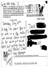 By 3pm, we had reached Walsenburg, CO. (about 200 miles in 4 hours. Damn traffic jam.) I know this because one thing I loved doing on this trip was grabbing postcards everywhere we went and mailing them right away to my 11 year old daughter who was home with Grandma. I thought she would enjoy receiving them while we were gone. Below is the one she received from Walsenburg 🙂