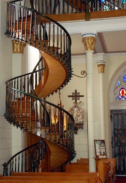 The resulting staircase is an impressive work of carpentry. It ascends twenty feet, making two complete revolutions up to the choir loft without the use of nails or apparent center support. It has been surmised that the central spiral of the staircase is narrow enough to serve as a central beam. Nonetheless there was no attachment unto any wall or pole in the original stairway and the wood for the staircase cannot be found anywhere in the region. “