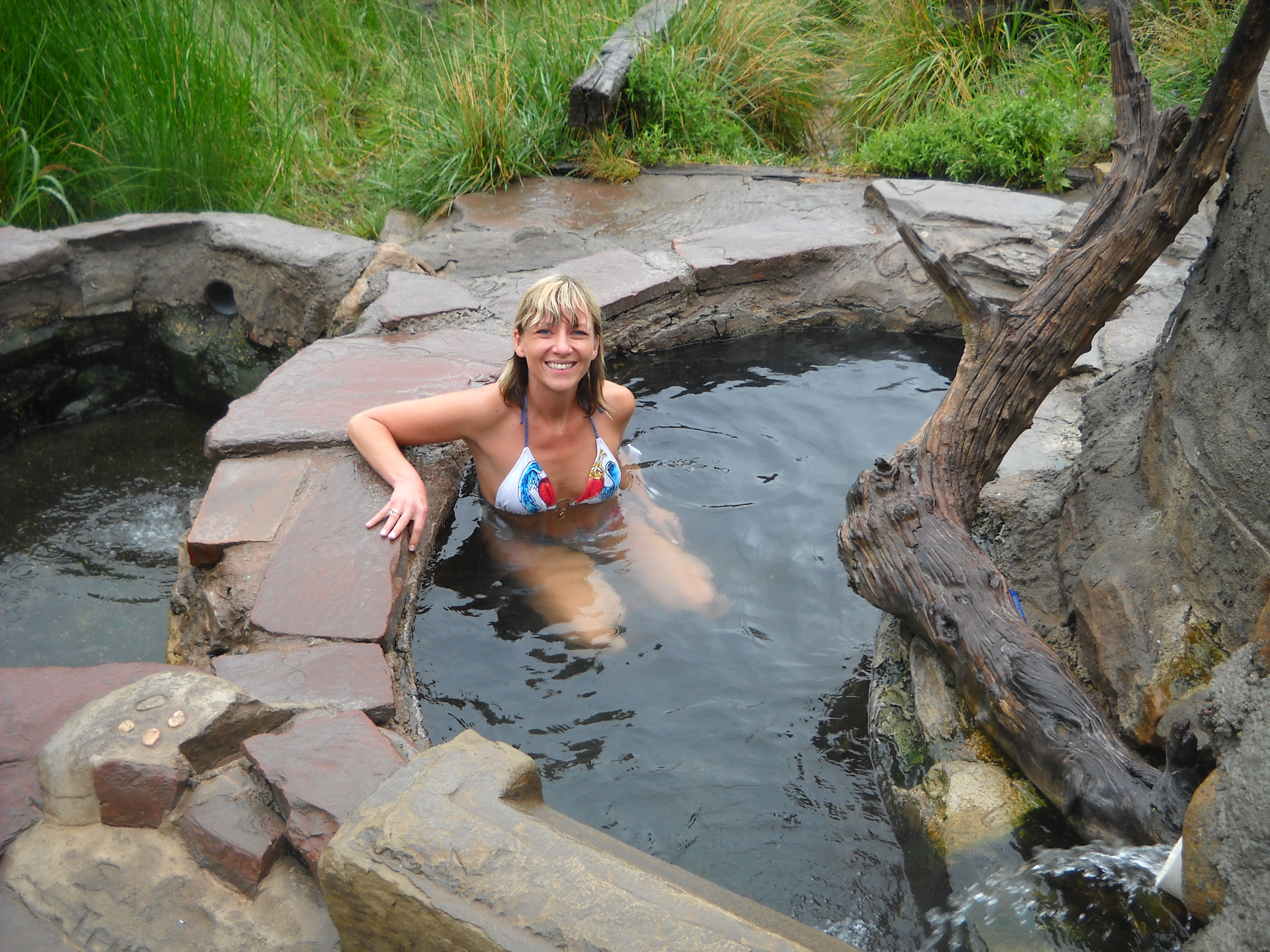 The mineral hot springs were awesome. They were very hot, in fact the largest, deepest pool was too hot to get into for our comfort. Which was okay, since that pool was really deep and had to be accessed by a ladder which had grown slippery with rain and pond scum. We chose the next deepest pool to sit in. It was a bit like sitting in a large fish aquarium, as the rock sides were slippery and coated with algae. Little bits of green flotsom floated loose when you scraped the sides…