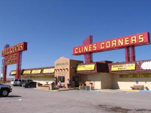 After leaving Santa Rosa, we headed west on the Route, toward Albuquerque. We hadn’t gone very far, though, before it became dark, and at the same time began to pour down rain in torrents. When what to our wandering eyes should appear? Why, Cline’s Corners, of course! At the junction of Highway 285 and Interstate-40 (once Route 66), Cline’s Corners in New Mexico has been a staple of the Route since 1934, even moving locations in 1937 to follow the new Route 66 alignment! A combination travel center, gas station, curios extravaganza -Cline’s offers the weary traveler everything they could need!