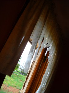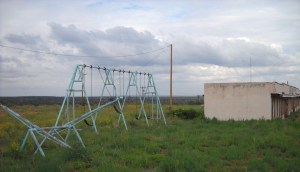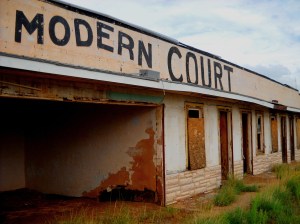 Not too far from the Auto museum on historic Route 66, we came across an old motor-court-style motel sitting abandoned and weary on the side of the road. Lake View Modern Court was still painted across the top of the motel itself, and a broken neon sign in front proclaimed The Pla… EL. Playground equipment to the side sat poignantly still. Broken down doors allowed access to the rooms and interior and we stood inside, solemnly paying testament to this vanishing bit of Route 66.