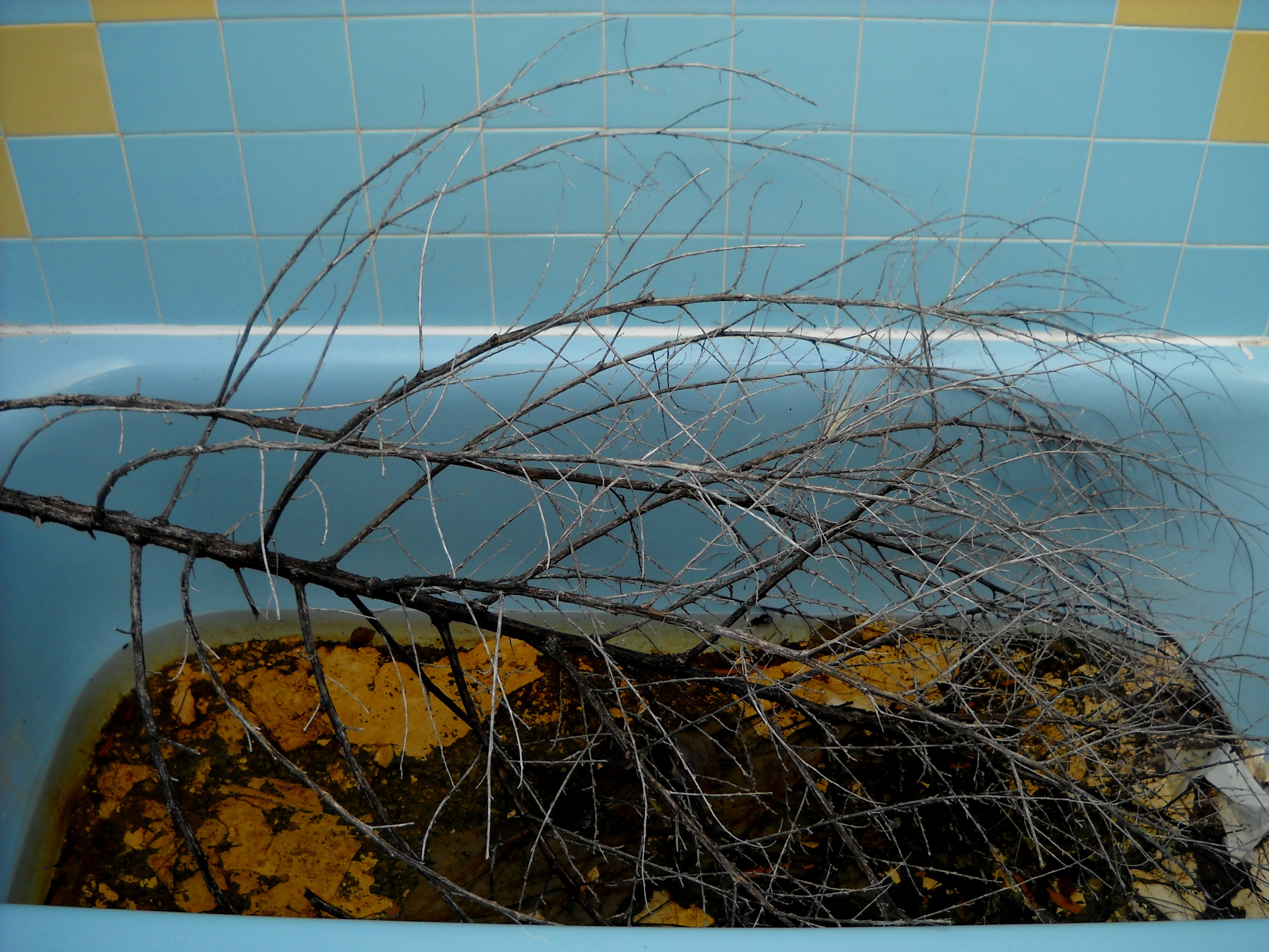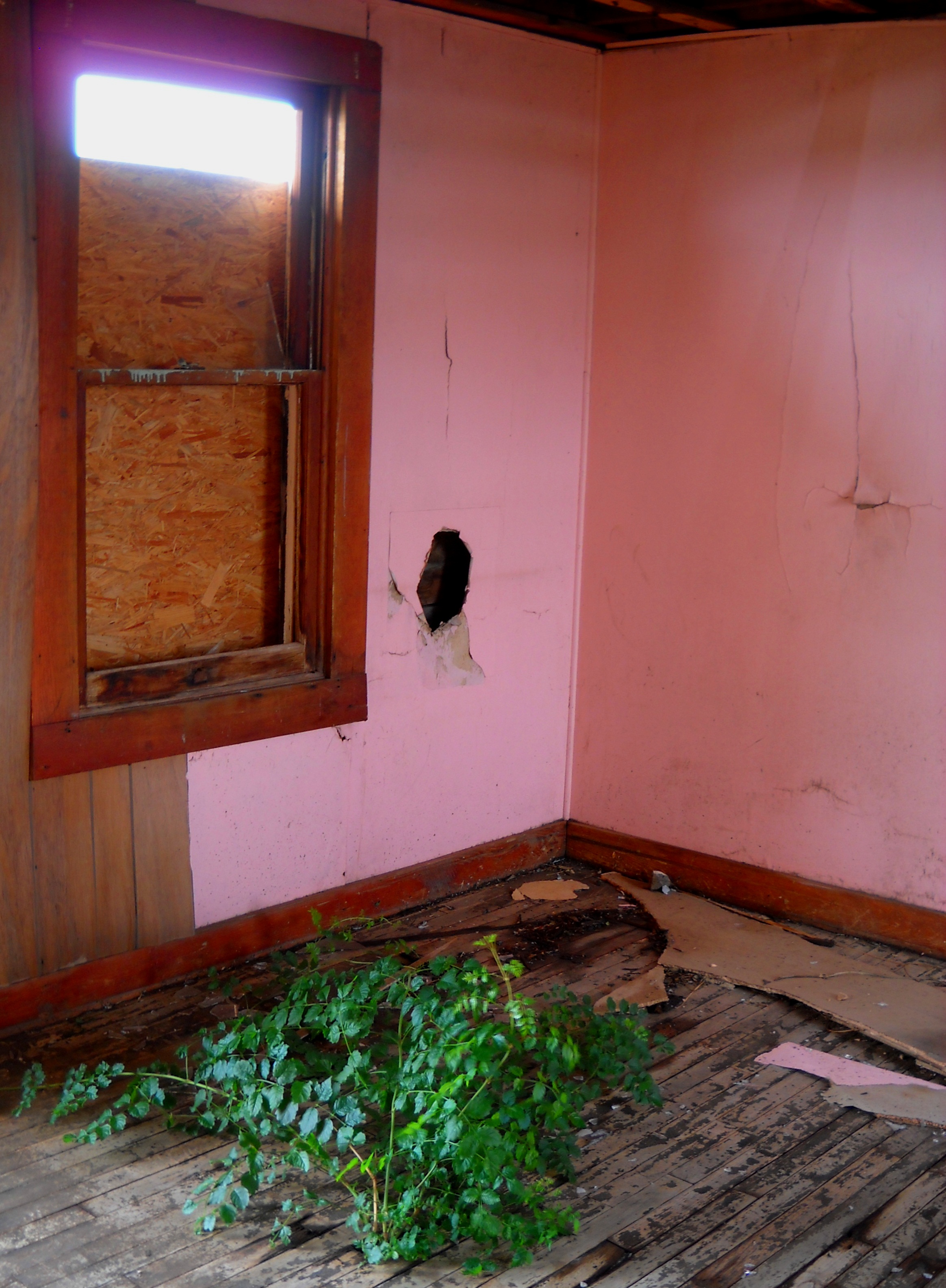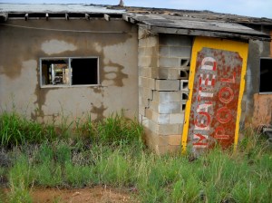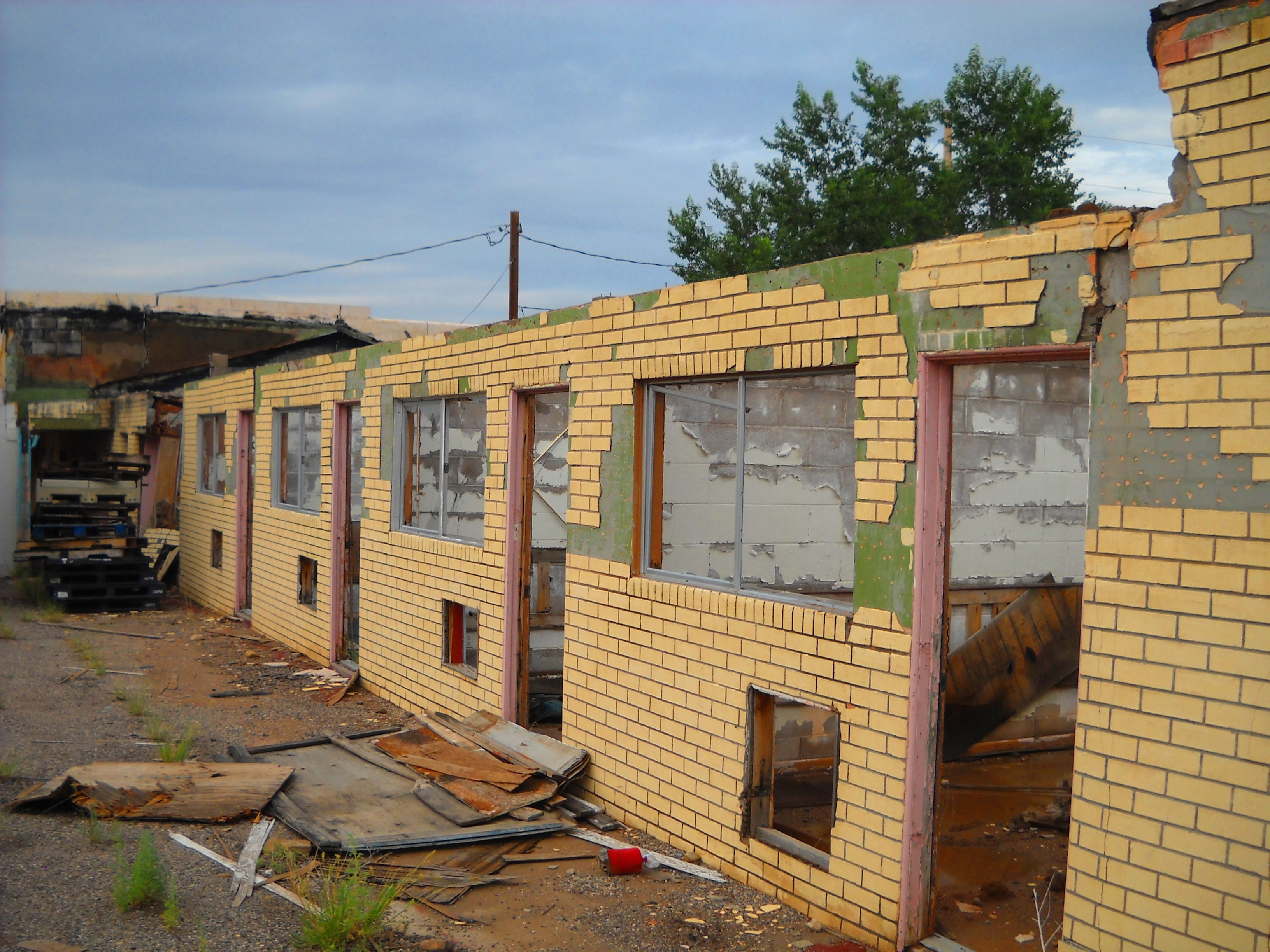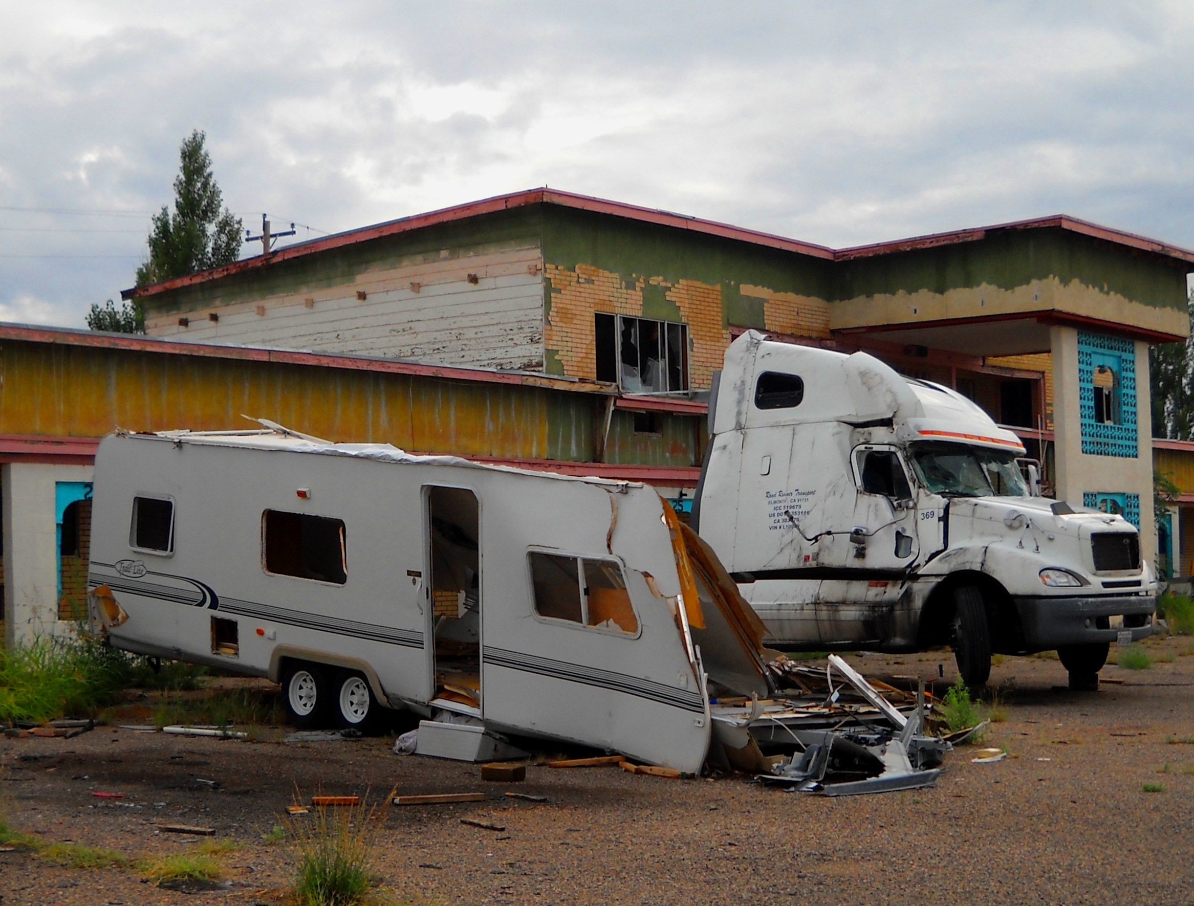 Further down the Route, we spied the top of what looked like an old motel peeking out from behind some sort of trucking / storage company. Further exploration revealed a real beauty… the stunning palette, the lovely lines, the strong bones, were all evident in this old gal, even as she sat in hopeless desolation; a storage site for broken-down old wrecks, vandalized and defiled.