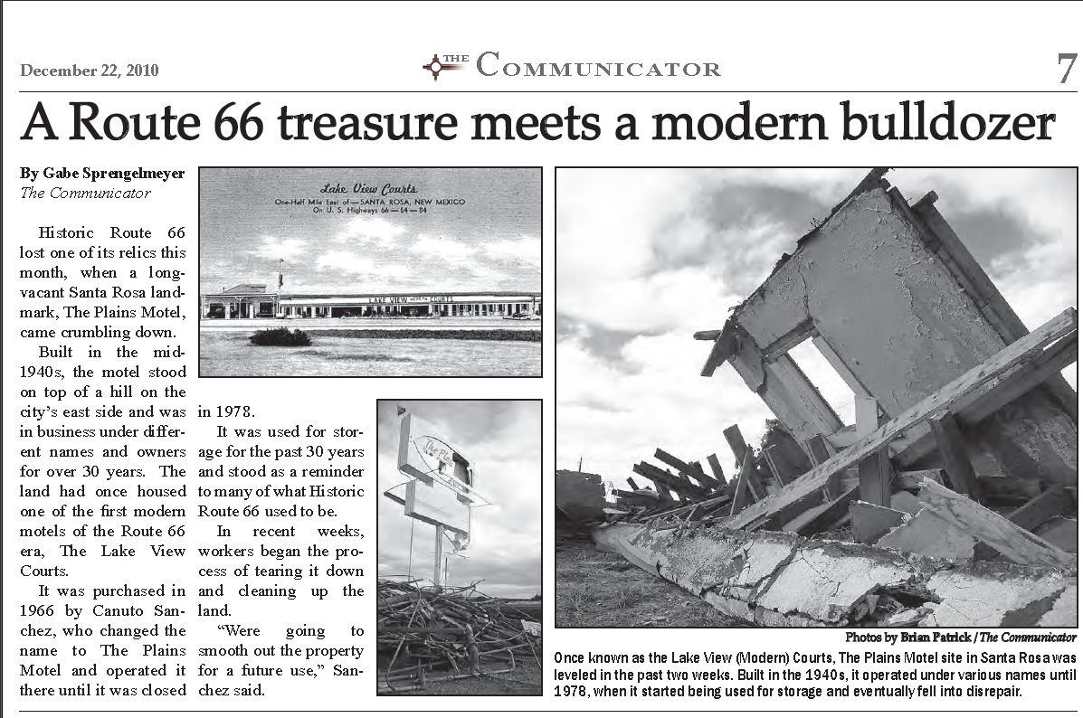 Kind reader Michael Gallegos, with The Guadalupe County Communicator, has notified me that The Plains Motel (Lake View Courts) met the bulldozer in December of 2010. See below for the story from The Communicator…