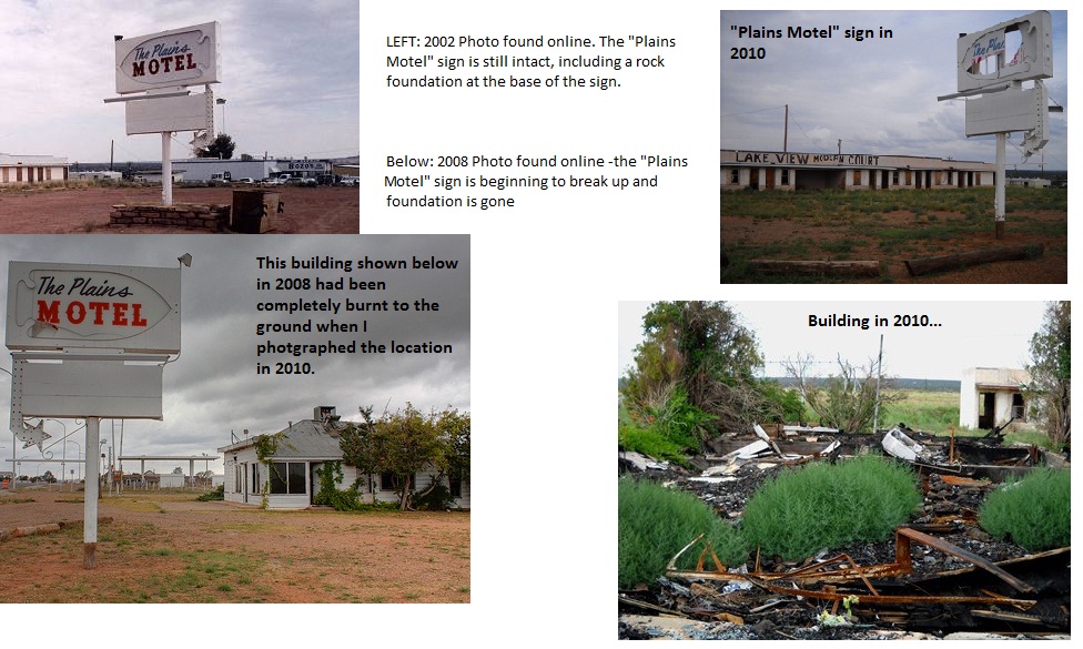 I HAVE TWO PHOTOS OF THE PLAINS MOTEL IN SANTA ROSA NM,I TOOK IN JUNE 1991.IT SHOWS THE MOTEL OFFICE INTACT,NO BROKEN WINDOWS,SIGN IS IN VERY GOOD CONDITION,NOT BROKEN.SIGN IS IN STONE FOUNDATION.IF YOU WANT,CONTACT ME,I WILL SEND YOU COPIES OF PHOTOS,FREE.THERE IS AN OLD CAR,ON MOTEL LOT.LOOKS LIKE AN OLDSMOBILE?PHOTOS ARE IN COLOR.