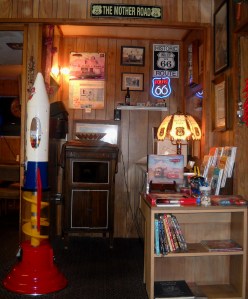 Our waiter was an absolute charmer. He told us hilarious stories about people he meets working on Route 66, stars that come in that he doesn’t always recognize, the enormous popularity of Route 66 with European travel groups (who knew?), and the connection with the Cafe and the crew of the Pixar movie Cars. If you weren’t already aware of it, Cars is based on Route 66 and the locations in the movie are conglomerates / composites of Route 66 icon images. An excellent article on that subject is available at http://rwarn17588.wordpress.com/2006/06/09/a-route-66-guide-to-the-cars-movie/.