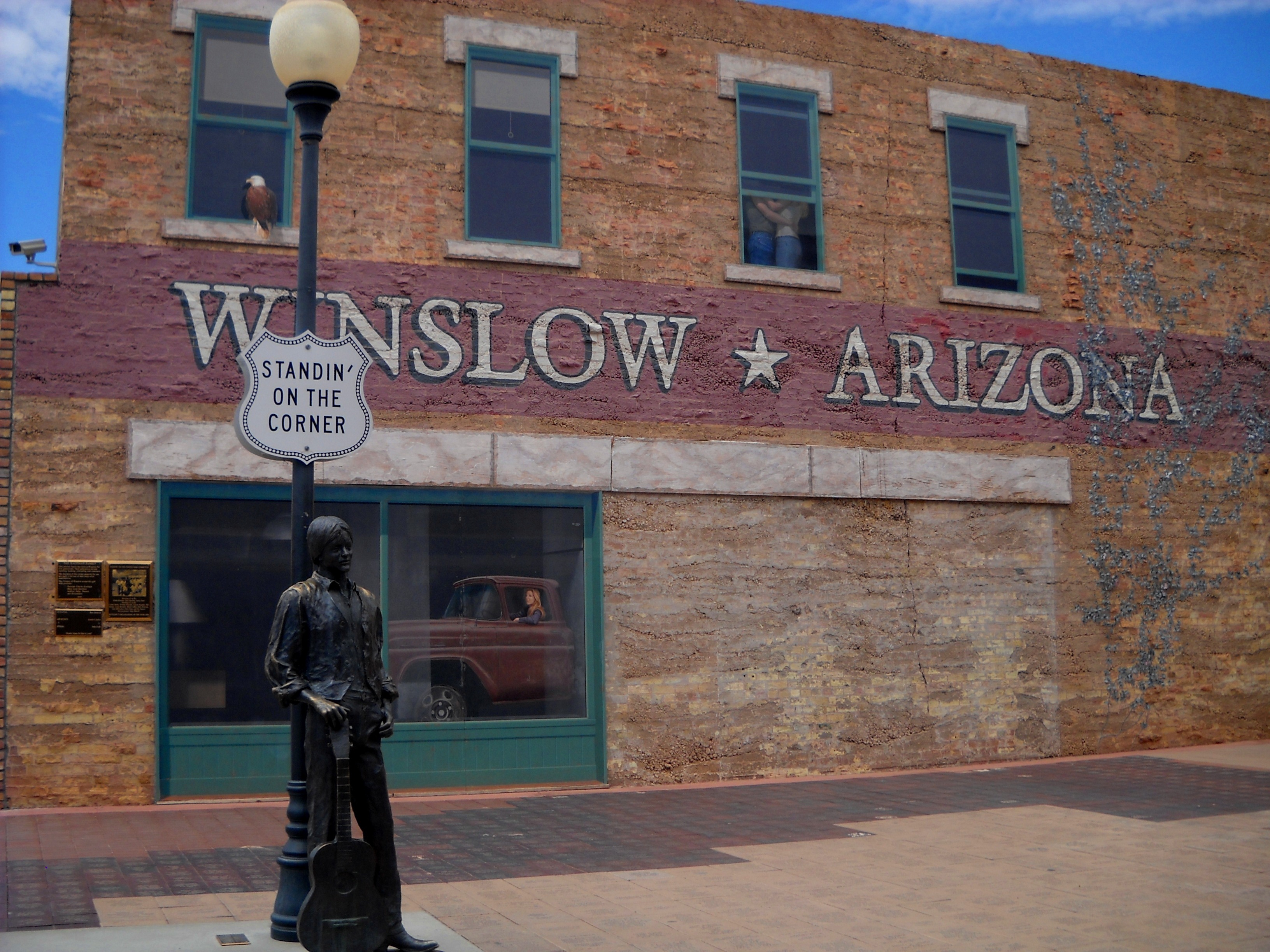 Winslow achieved national fame in 1972 when the Eagles released the song “Take it Easy” which has the line “standing on a corner in Winslow, Arizona.” An entire corner of the town is dedicated to the Eagles, and to this song, ~featuring a statue “standing on the corner”, a mural of a “girl in a flat bed Ford”, an eagle perched in a building window, and the constant silhouette of a couple making out in the window.