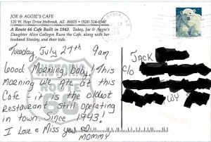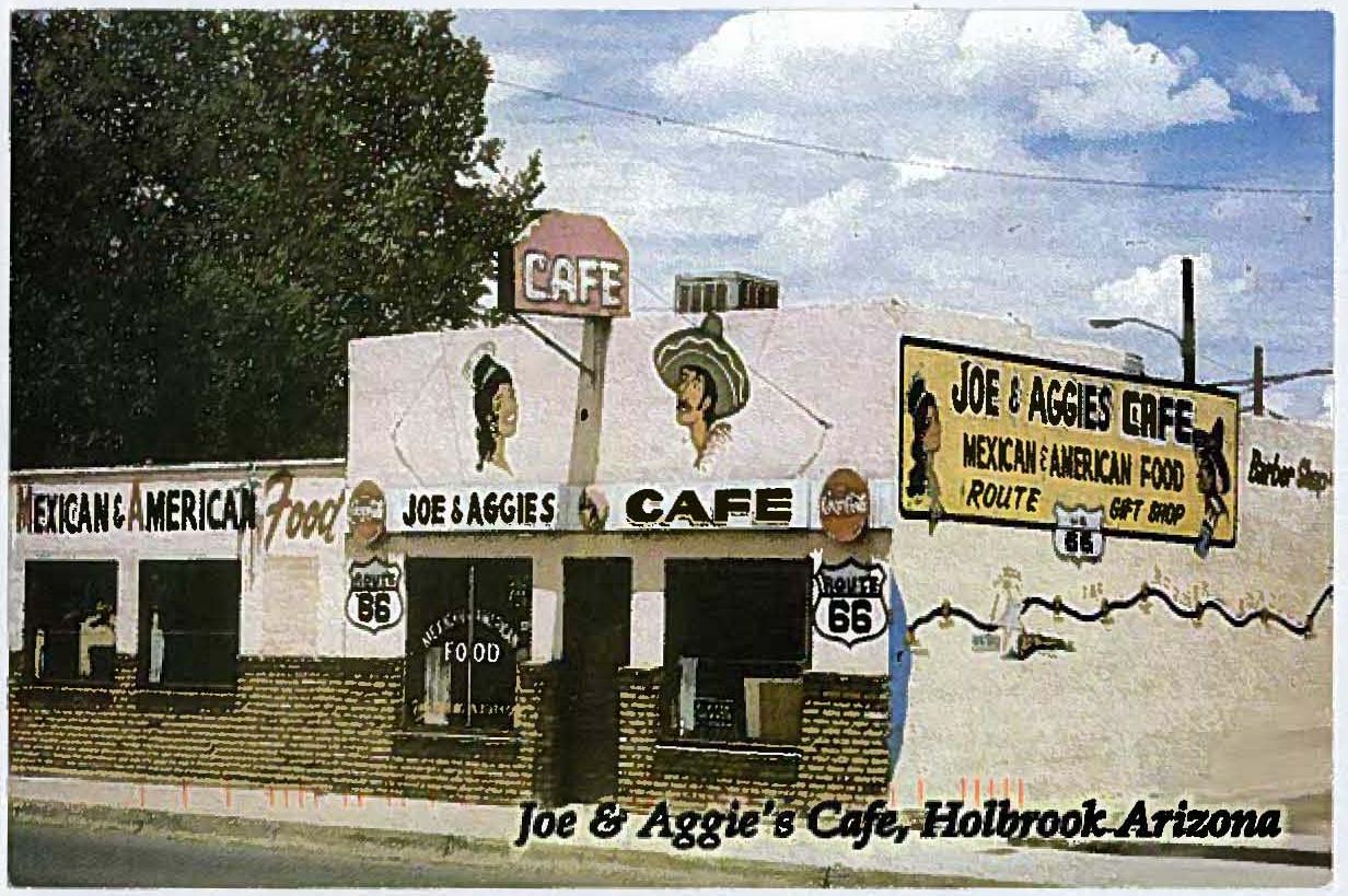 Holbrook, Arizona. The first town we’d come to where Route 66 is truly alive and well. Holbrook is home to the Wigwam Motel, one of the last two surviving “Wigwam Village style” motels in the U.S. -the penultimate in a chain of seven built from 1933 to 1950. This little Arizona town also boasts several mural-tributes to Route 66, painted on the walls of its downtown businesses. Here as well you will find Joe & Aggie’s Cafe -a Route 66 favorite since 1943.