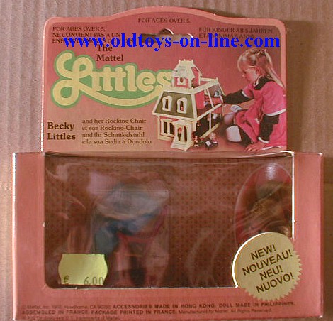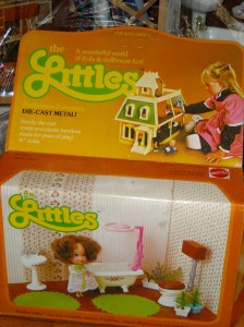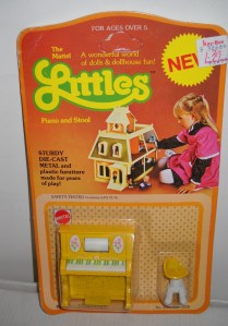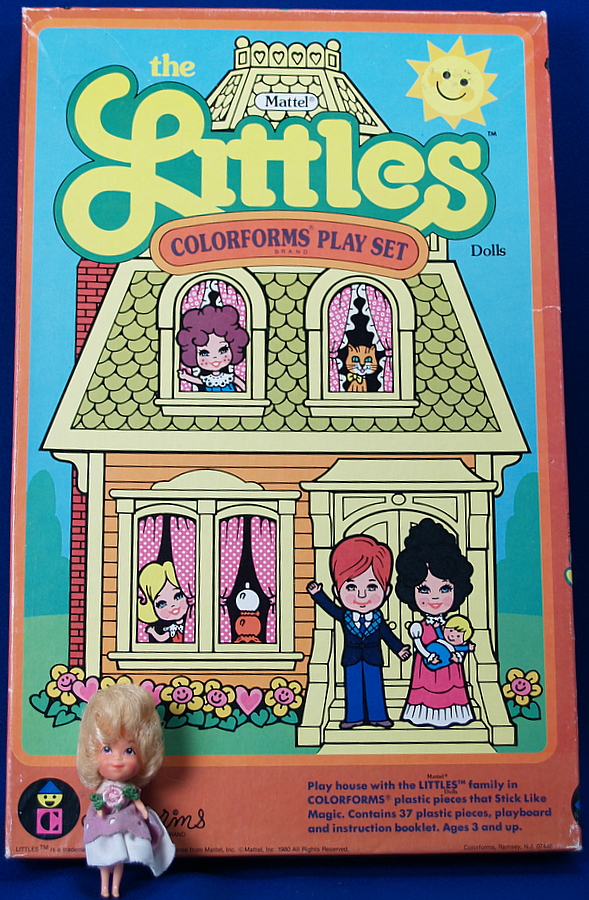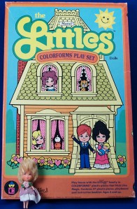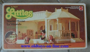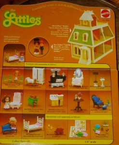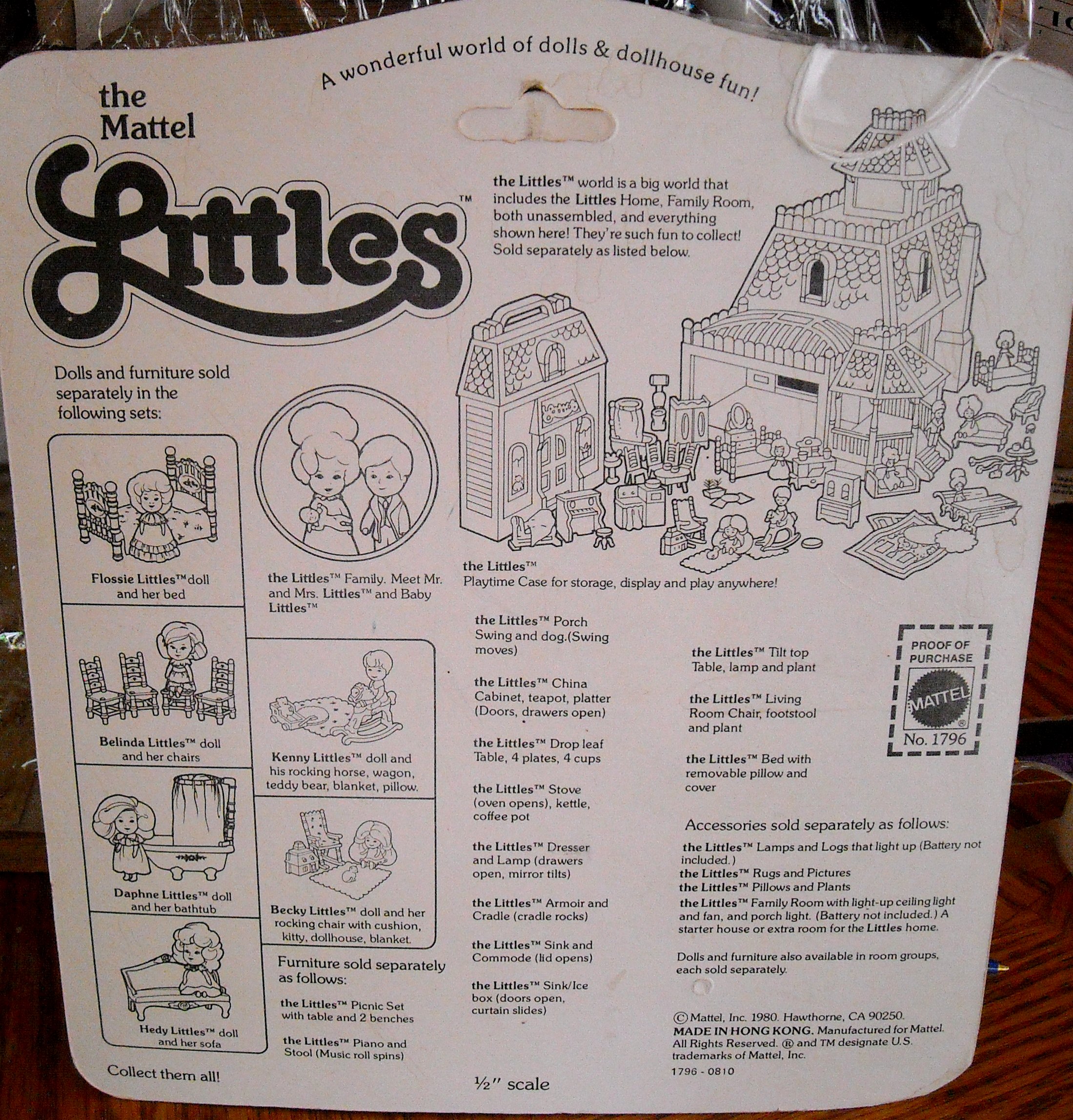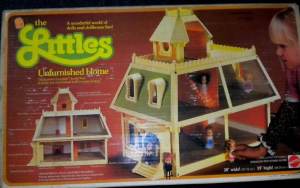 In 1980, Mattel released The Littles playsets. The dollhouse was a Victorian-style plastic mansion, multi-colored and awesome. All the furniture was sold separately, and was a high quality die-cast metal with opening drawers and fine detailing. You could buy accessories separately to complete your dollhouse, including an outdoor picnic table set, rugs, dishes, pillows, plants, lamps, and even a set of light-up fireplace logs and light-up lamps that could be wired through the fireplace in the living room, and would then actually illuminate. The Littles dolls were 2 1/2 inches high, with rather tiny bodies and large heads. They consisted of Mr. & Mrs Littles and Baby Littles, Belinda Littles, Daphne Littles, Hedy Littles, Flossie Littles, and later, Kenny & Becky Littles.
