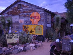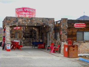 We drove across the drainage of the Sacramento Wash and then up into the Black Mountains. Our first stop as we climbed the Gold Hill Grade was recently rebuilt Cool Springs. Originally, Cool Springs Service Station offered gas, cabins, a cafe, and a bar -a welcome stop in 1926 for weary travelers. However, when this section of Route 66 was bypassed in 1953, Cool Springs quickly fell into disrepair and was abandoned by 1964. In the 90’s, the store was rebuilt by Hollywood, only to be blown up in a scene from the movie Universal Soldier. A pile of blackened rubble, it sat duty as a lonely mountain sentinel until purchased by Ned Leuchtner in 2001. Using original, vintage photographs, Leuchtner began a careful restoration, and by 2004, Cool Springs stood ready again to offer respite to the Route 66 traveller.