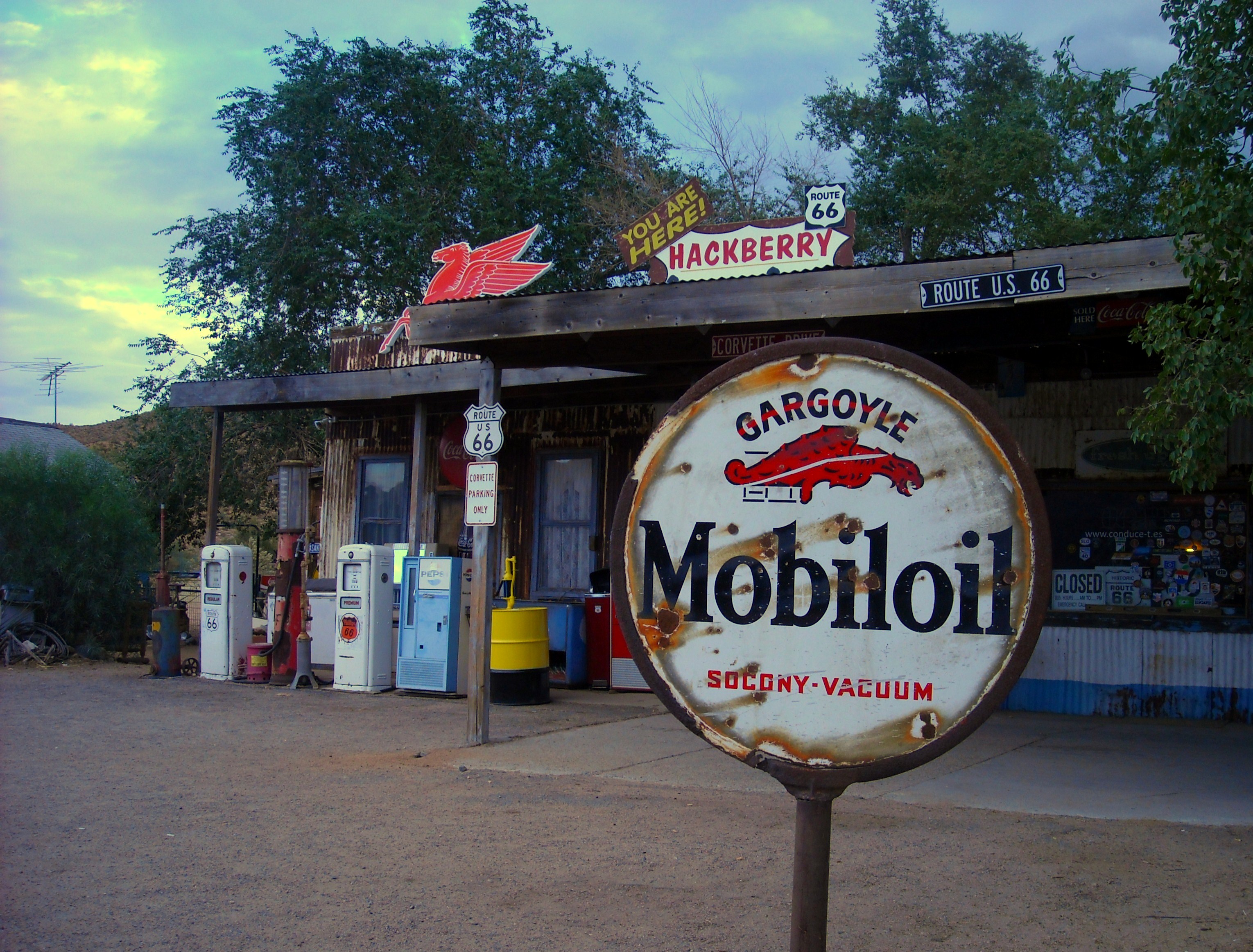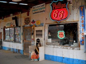 Cool Springs offers a nice display of vintage Mobilgas pumps, a small museum of Route 66 items in the back of the store, and a fine selection of Route 66 soda pops. We bought the set. The manager of the place, much like other Route proprietors and employees that we had met so far, was friendly, garrulous, and interesting. He lived on site, in a small camper set up behind the store, complete with a deck and hot tub. He philosophized to us a bit on the glories of the Route and his place in it. When asked if he enjoyed the solitude, he opinioned that there was nothing quite like closing up in the evenings and retiring to his hot tub to drink a glass of wine and contemplate the Arizona night.