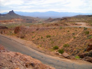 Leaving the Visitor Center, we encountered a twisty little entangling of highways out of Kingman and carefully followed the directions in our EZ Guide to 66. Misreading this guide, though, is much easier than you’d think and we soon found ourselves on Highway 93, heading to Vegas. Fortunately, we had Big-Ass lattes by this time, so took this in stride and managed to get turned around and back on I-40 / Hwy 66 in short time. Ahead of us lay the Oatman Highway section of Route 66, described in our guide as “VERY steep and crooked, with deliciously scary drops!” and acknowledged, along with La Bajada Hill, as the most perilous road on the entirety of Route 66.