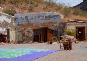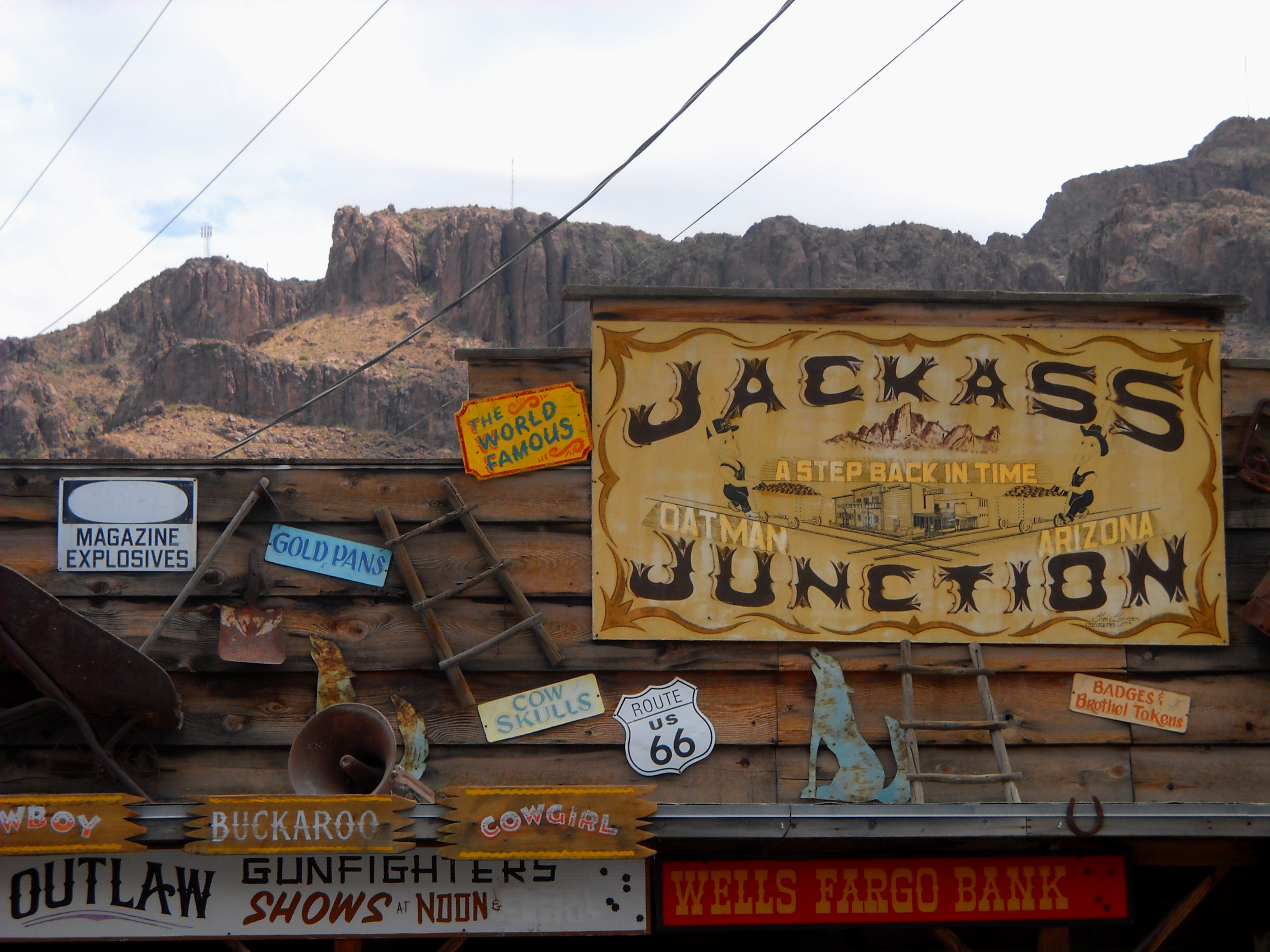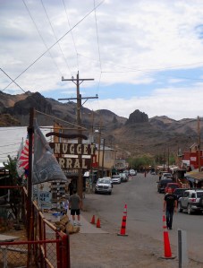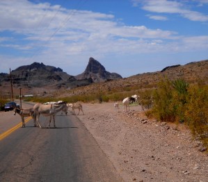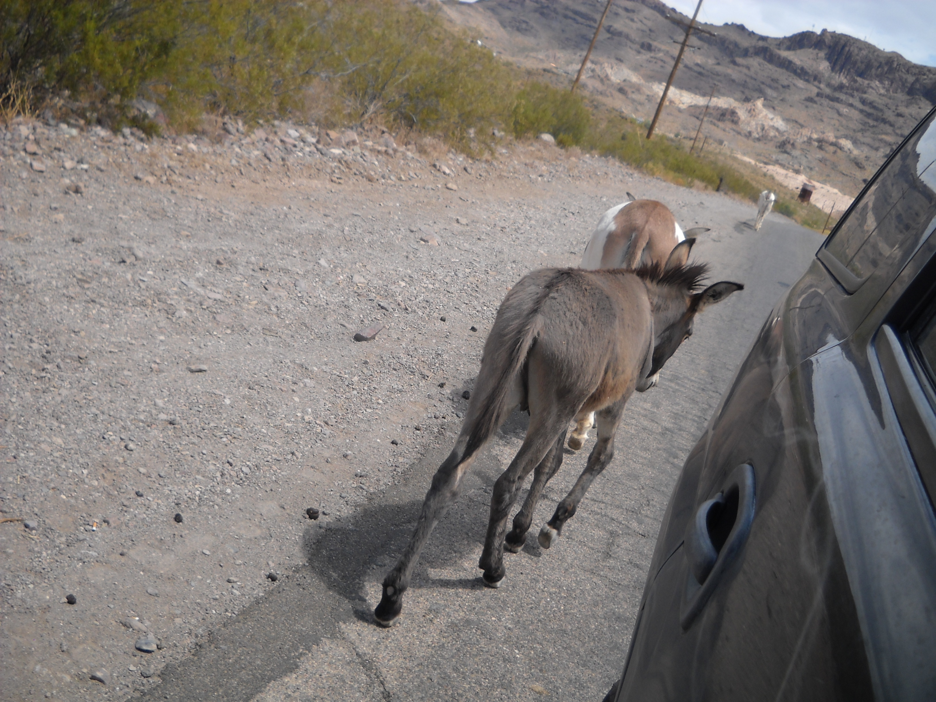 After the fish bowl, we reached 3550 ft high Sitgreaves Pass and then it was time for the steep downward descent that would bring us to Oatman, AZ. This really is a beautiful drive, and fascinating to see all the remains of long abandoned gold mines. Be careful, though, mining is still going on here and mine foremen get downright tetchy about tourists stepping on to private mining lands, even if said tourists had no idea that’s what they were doing. Words such as federal prison, steep fines, and “hey you what the hell do you think you’re doing?” are bandied about.