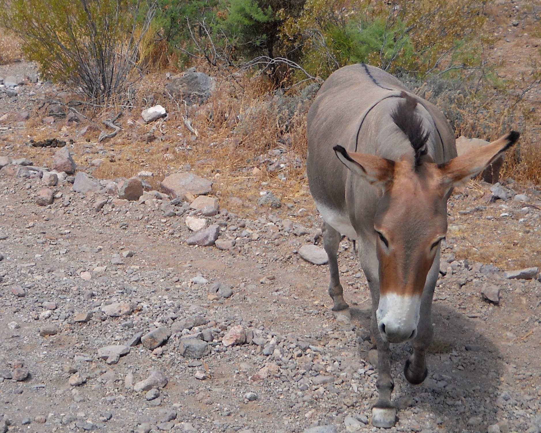 Everything we had read about Oatman described the burros as so thick on the ground you had to push them out of your way to walk the sidewalks (in Oatman -these consist of board planks). We had seen one burro coming down the mountain to whet my appetite and I was all a-twitter, just couldn’t wait to feed and pet a soft, fuzzy burro.