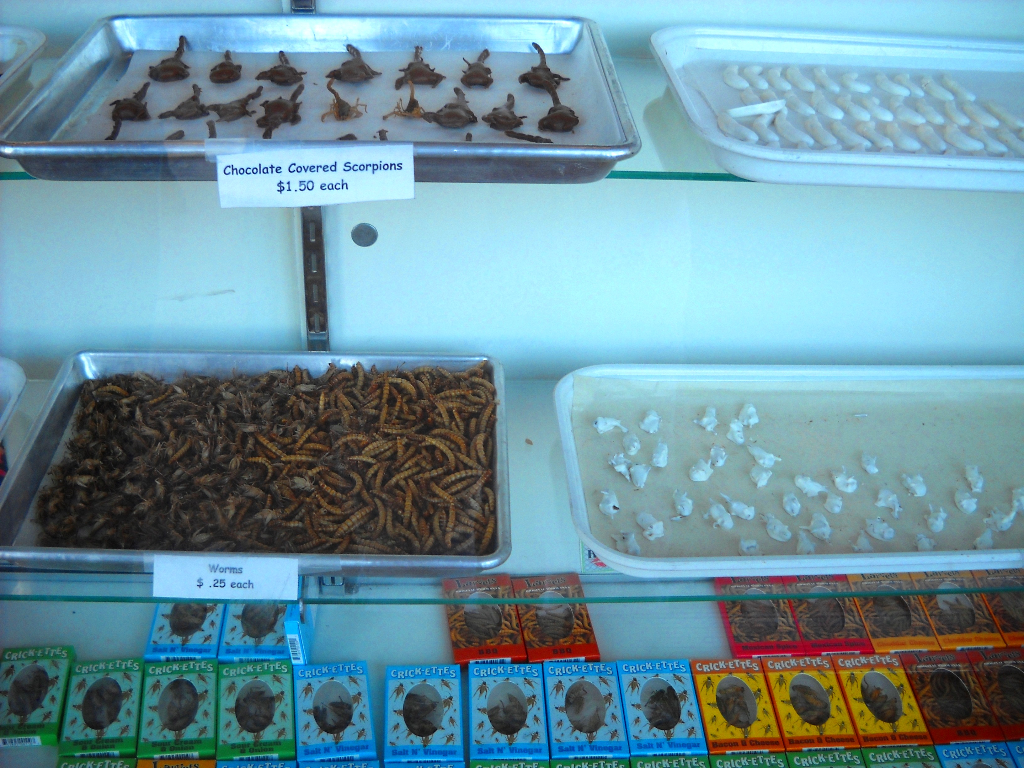 Tequila Worm Suckers. Ants, Crickets, Scorpions, and Worms. Both chocolate-covered and plain. All available at the Hotlix Candy Store in Pismo Beach. Not planning a trip to the California Coast soon enough to satisfy your sweet insect craving? Not to worry! They also run a booming on-line business -you can order your crispy dried earthworms, cinnamon encased tequila worm pop, or chocolaty coated crickets right NOW! Don’t delay, they’re probably better fresh. I wouldn’t know for sure, though, I couldn’t get my husband to try one, even though I double-dog-dared him. He proceeded to triple-dog-dare me to eat one, and I was so appalled at the very idea, that I dropped the conversation entirely. After repeated, dramatic, and exaggerated gagging gestures. Damn, he’s sneaky that way.