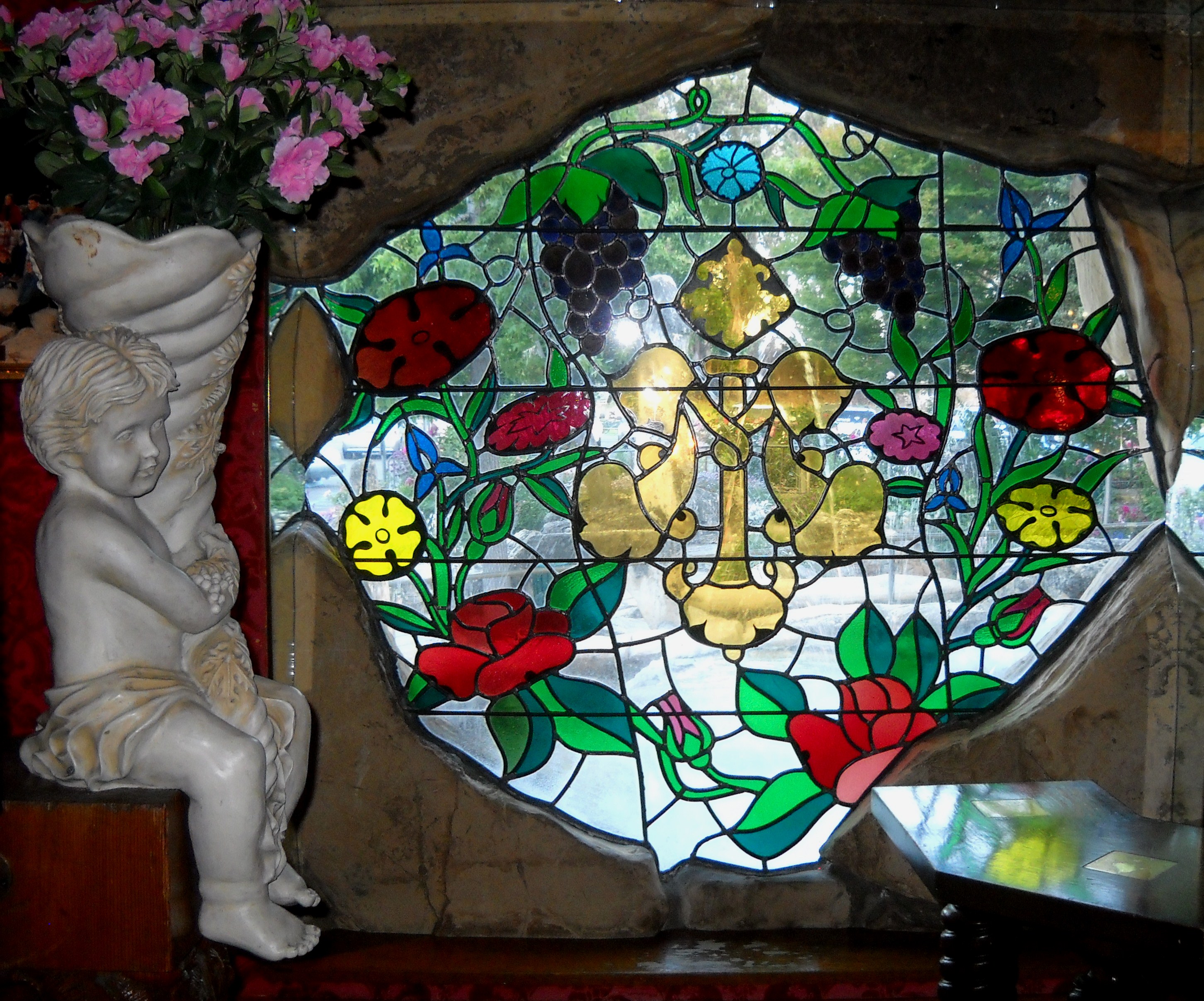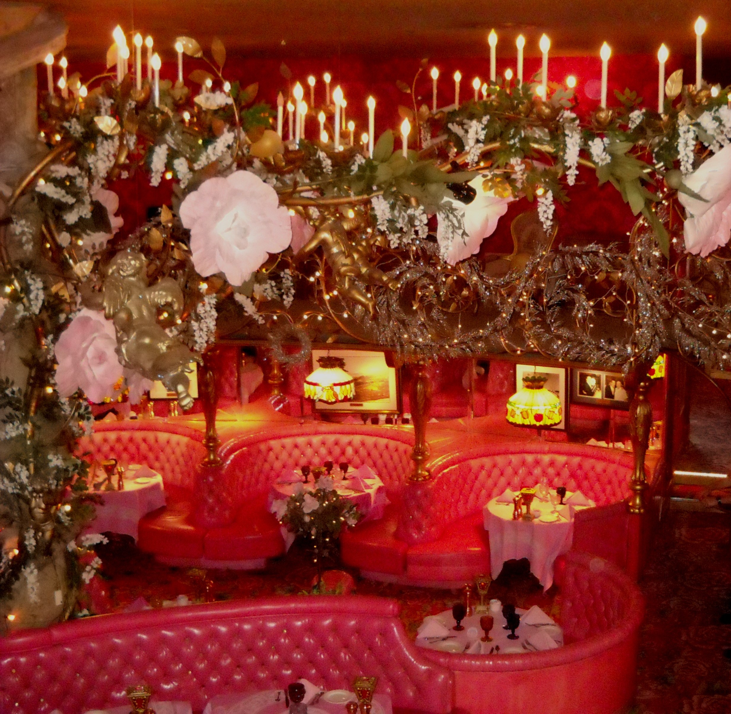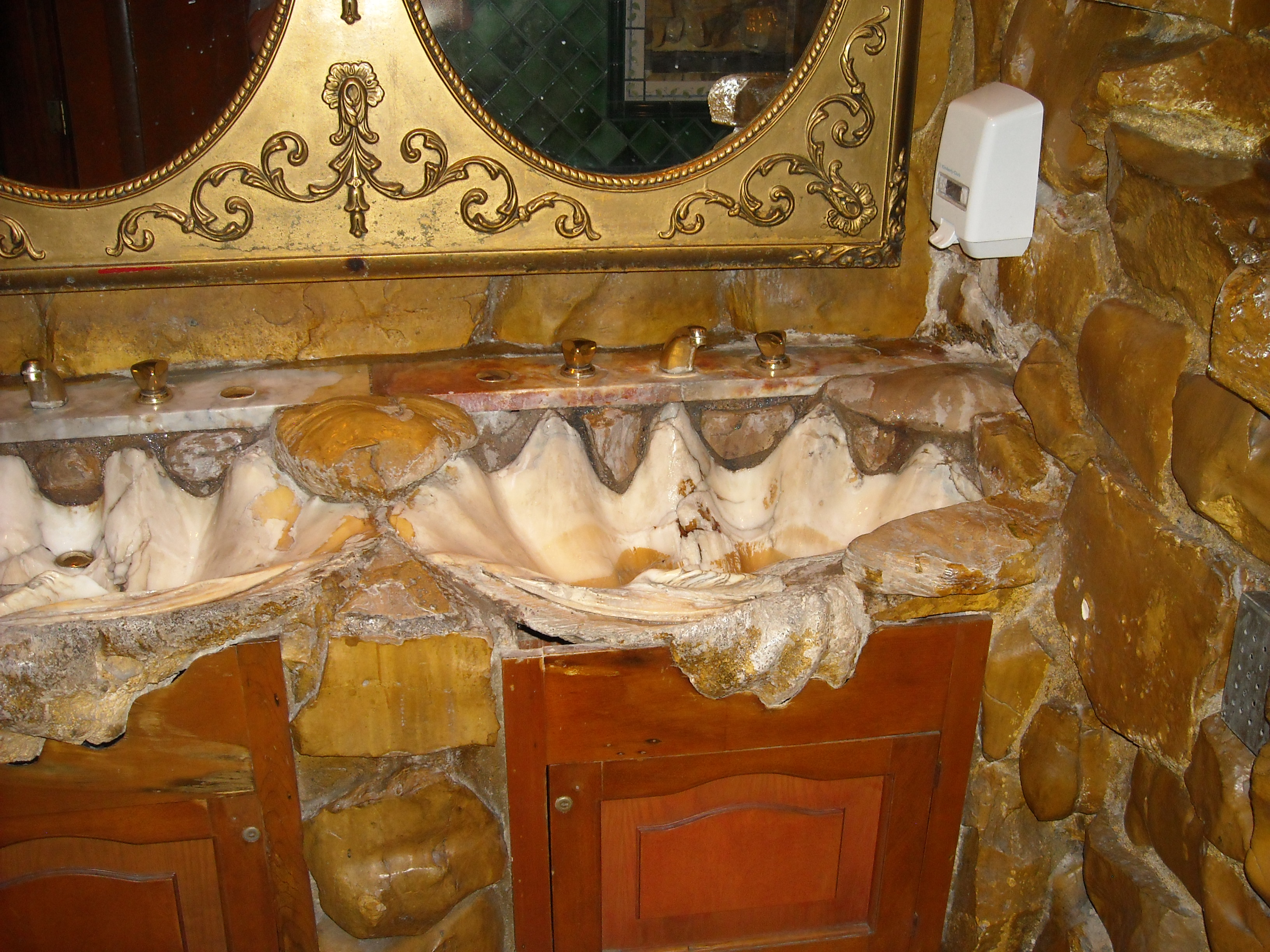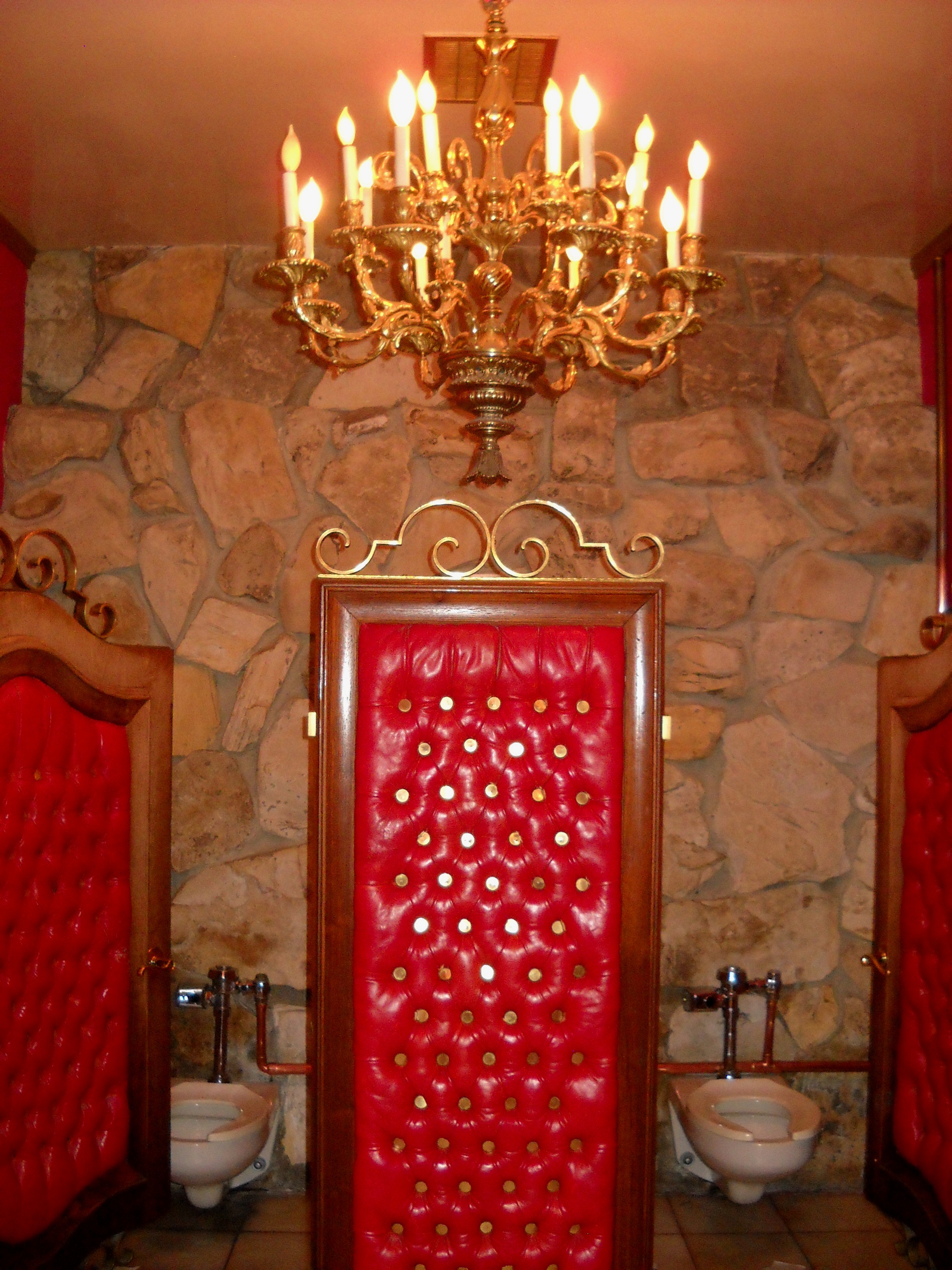 Alex & Phyllis Madonna created the Inn, and apparently Mrs. Madonna took over the decor. She designed the ladies’ public restroom like an extravagant palace. Mr. Madonna apparently felt it was time the men around there had a say, and he one-upped her by designing a public mens’ room equally lavish, but with a unique addition. The urinal appears to be just a rock wall over a marbled floor. Once a man begins peeing, though, his “stream” activates a laser that starts a waterfall cascading down the rocks….