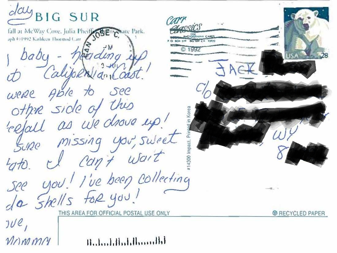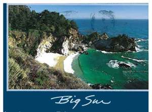 North of the Cafe on Hwy 1, we came to Julia Pfeiffer Burns State Park, the first slice of Big Sur, CA, boasting redwood groves, McWay Falls (an 80-foot waterfall that drops into the ocean), granite cliffs, and panoramic views. In order to hike to the falls, though, you must pay the $10.00 day fee to park, which we declined to do, so we contented ourselves with a view of the park area from the highway.