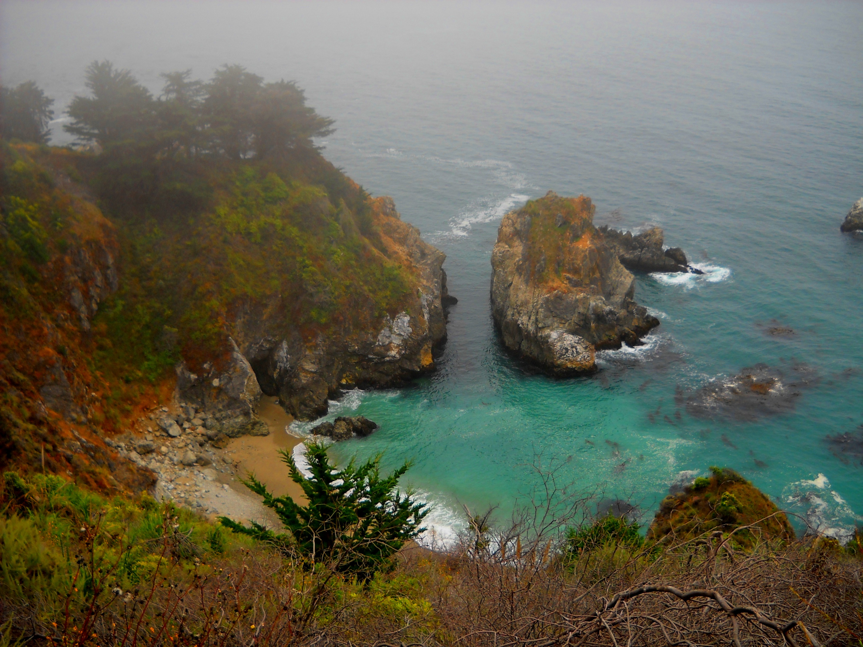 The fog was thick around us as we clambored into the seats of the tahoe. Though we could hear the ocean, we could not yet see it this morning, or much of anything else as we proceeded north up the California coast. Just the winding road ahead, seemingly looping into and out of the soft, white blanket of heavy mists. It was silent and enveloping, and the breeze through the window smelled of wet, growing fronds and fecund soils. I enjoyed the shifting patterns of clouds on the ground, and the scents of the temperate rainforest, …and avoided speaking for the sake of my husband. Though we had the beauty of the sea, and the mystery of the fog, we did not yet have coffee, and to be honest, I’m somewhat cranky without it.