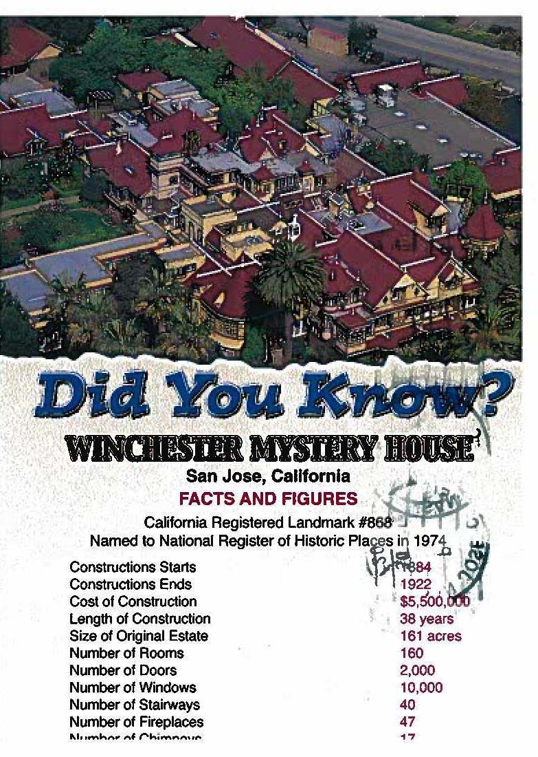 The result was a seven-story Victorian (now only four stories due to the earthquake of 1906) that covers 4 1/2 acres.There are roughly 160 rooms, including 40 bedrooms, two ballrooms, 13 bathrooms, six kitchens, and two basements. The house boasts 47 fireplaces, 47 stairways, 10,000 windows, 2000 doors, 17 chimneys (with evidence of two others), and three elevators.