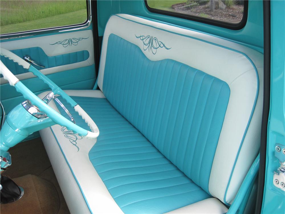 Classic seats like the one in this 1956 Chevy were the inspiration for my original plan. I had in mind turquoise vinyl cushions, with a large white vinyl chevron on the back of each, and tangerine colored vinyl piping.