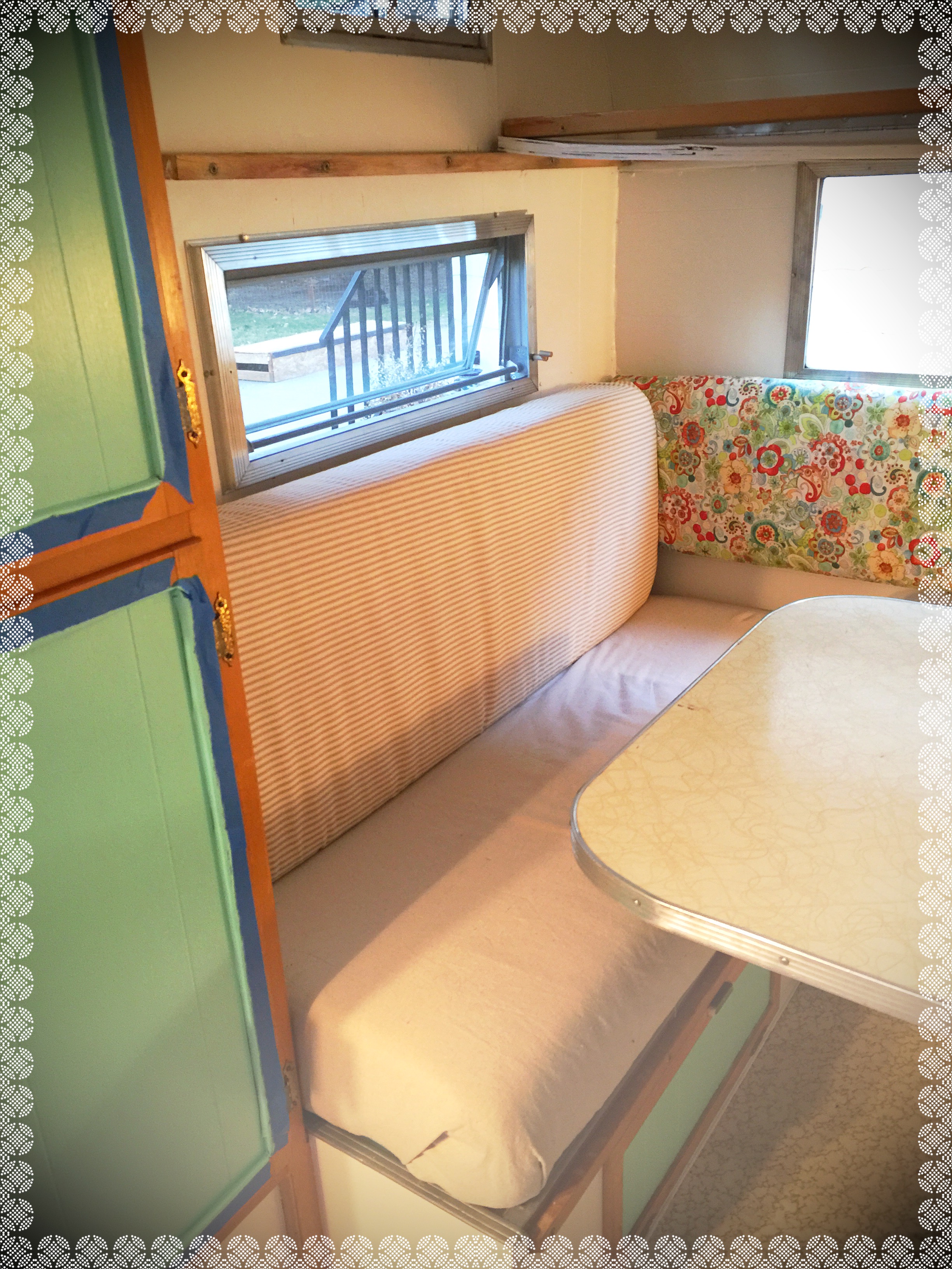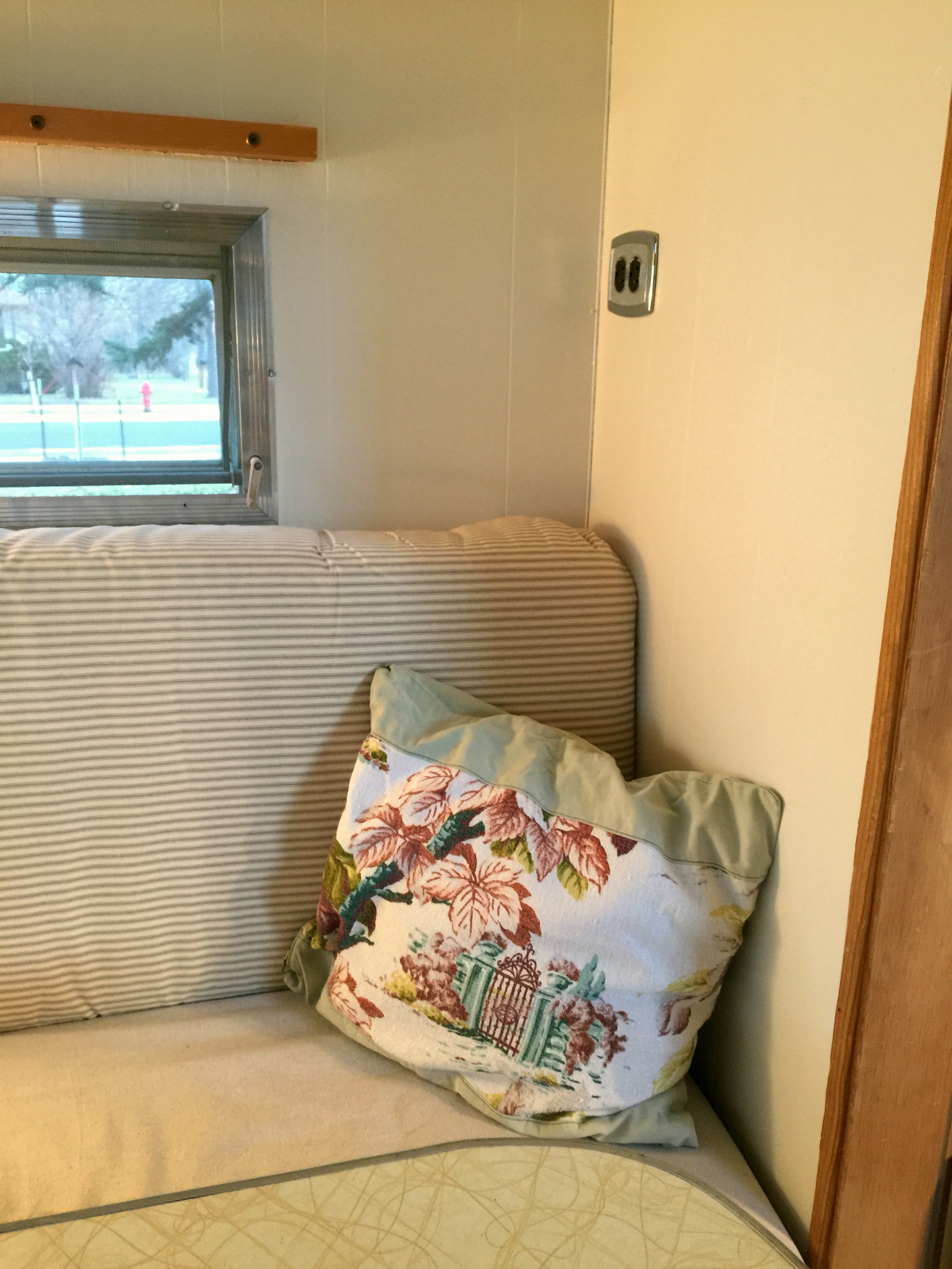 I’m going to jump ahead in time, here, so that I can post the photos of the cushions once I placed them back into Myrtle. We were all prepared to paint Myrtle’s exterior in late August, when we were hit by a week of summer rain storms. I completed the cushions during this time, but did not yet have Myrtle’s interior ready. They actually hung out in my house until early November, I believe, when the rear interior of the camper was completed enough for them to go back in. Regardless, I’m going to fast-forward in time just enough to post those pictures here. 🙂