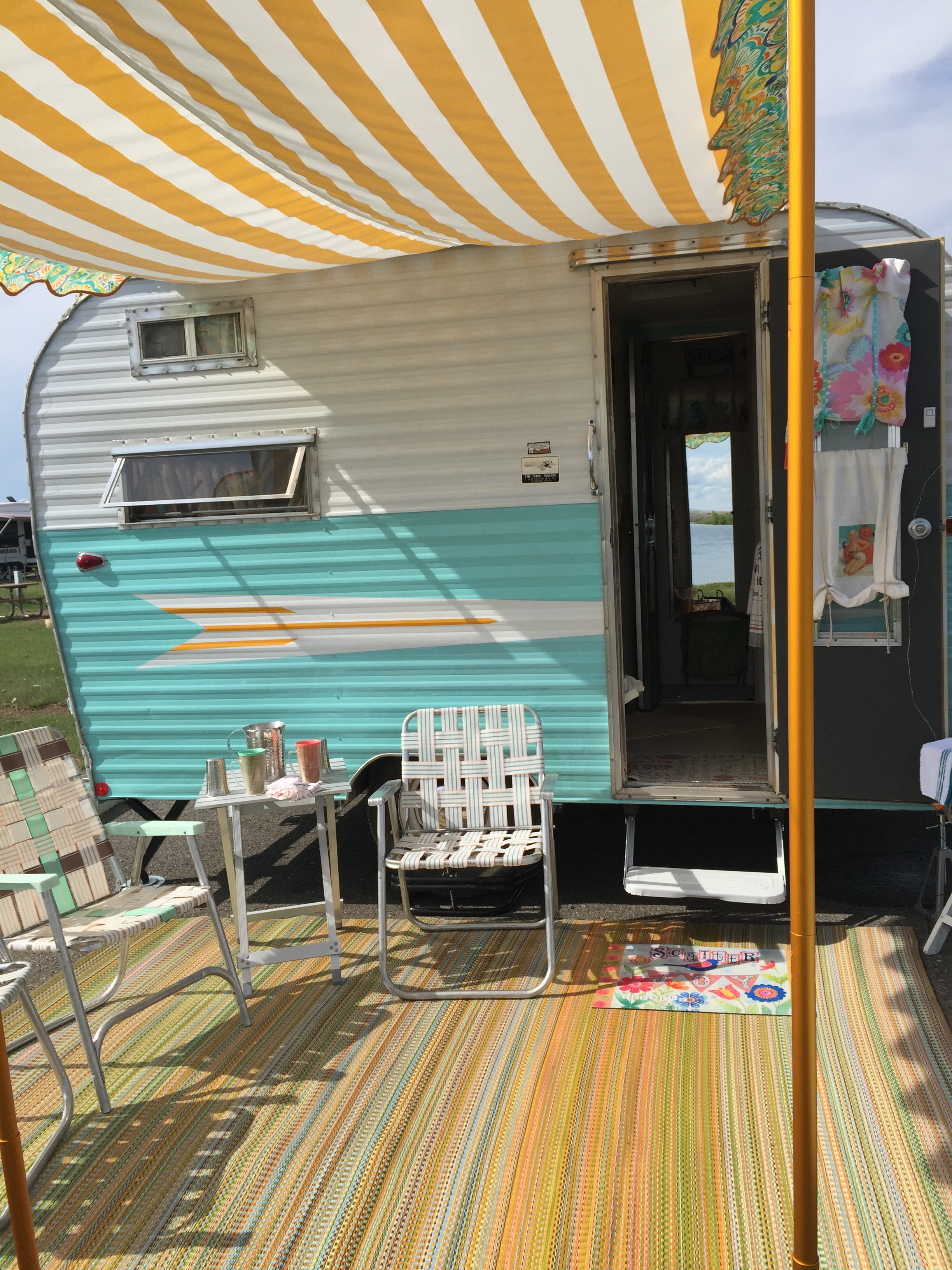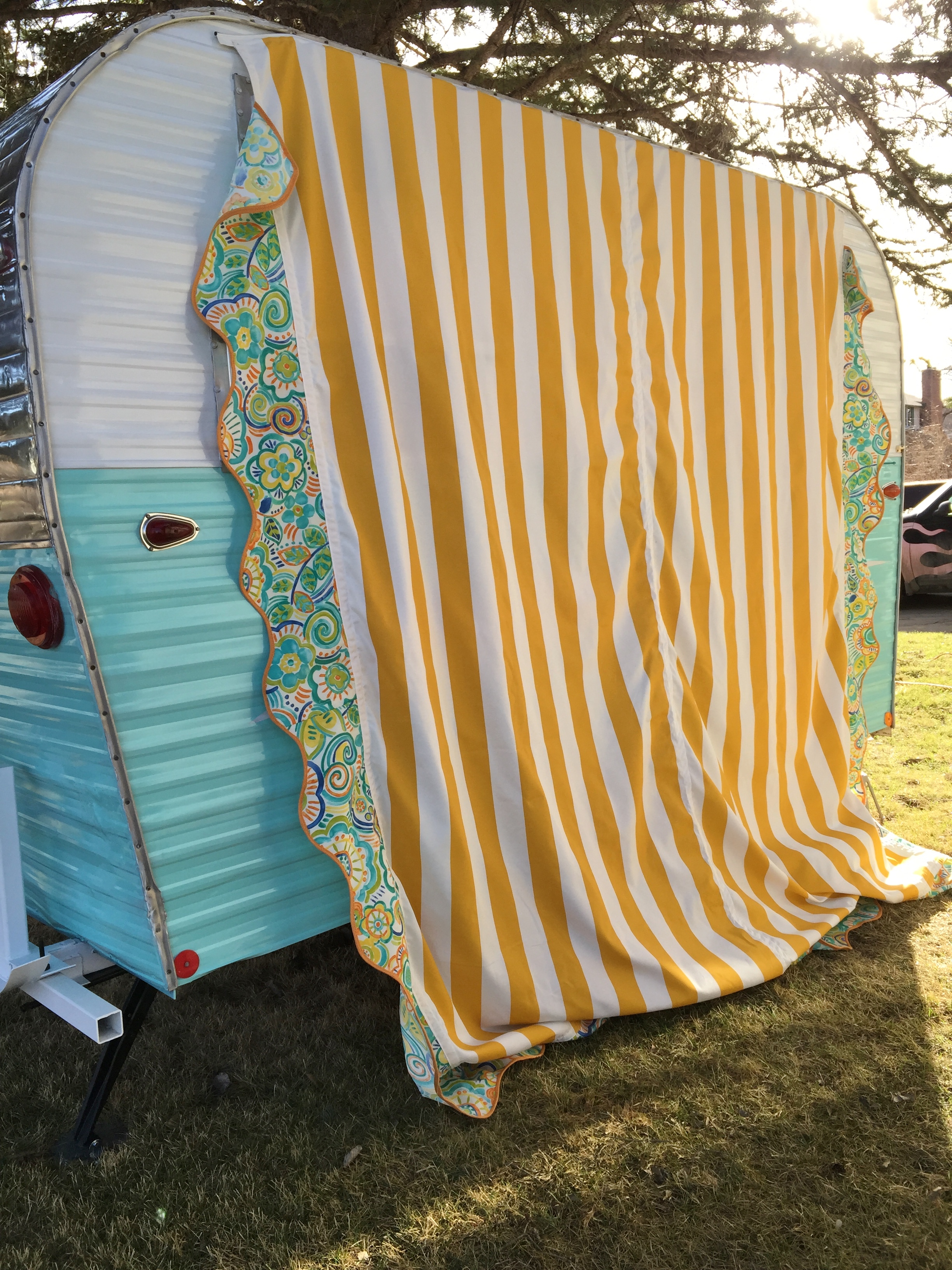But before I made it to this last stage of decorating, there were a few final touches to the outer ambiance. Sometime during the final interior painting phase, a very special package arrived for Myrtle. Inside said package was her custom, vintage-style, pole & rope awning. Truly, the icing on my vintage camper cake. I ordered Myrtle’s awning from Tin Can Awnings, where what you want is what you get! Rather than keeping a standard selection of outdoor fabrics on-hand, the proprietress steers you to a wide selection of outdoor fabrics available online; you make your choice, and she orders what you’ve chosen to create a truly custom awning.