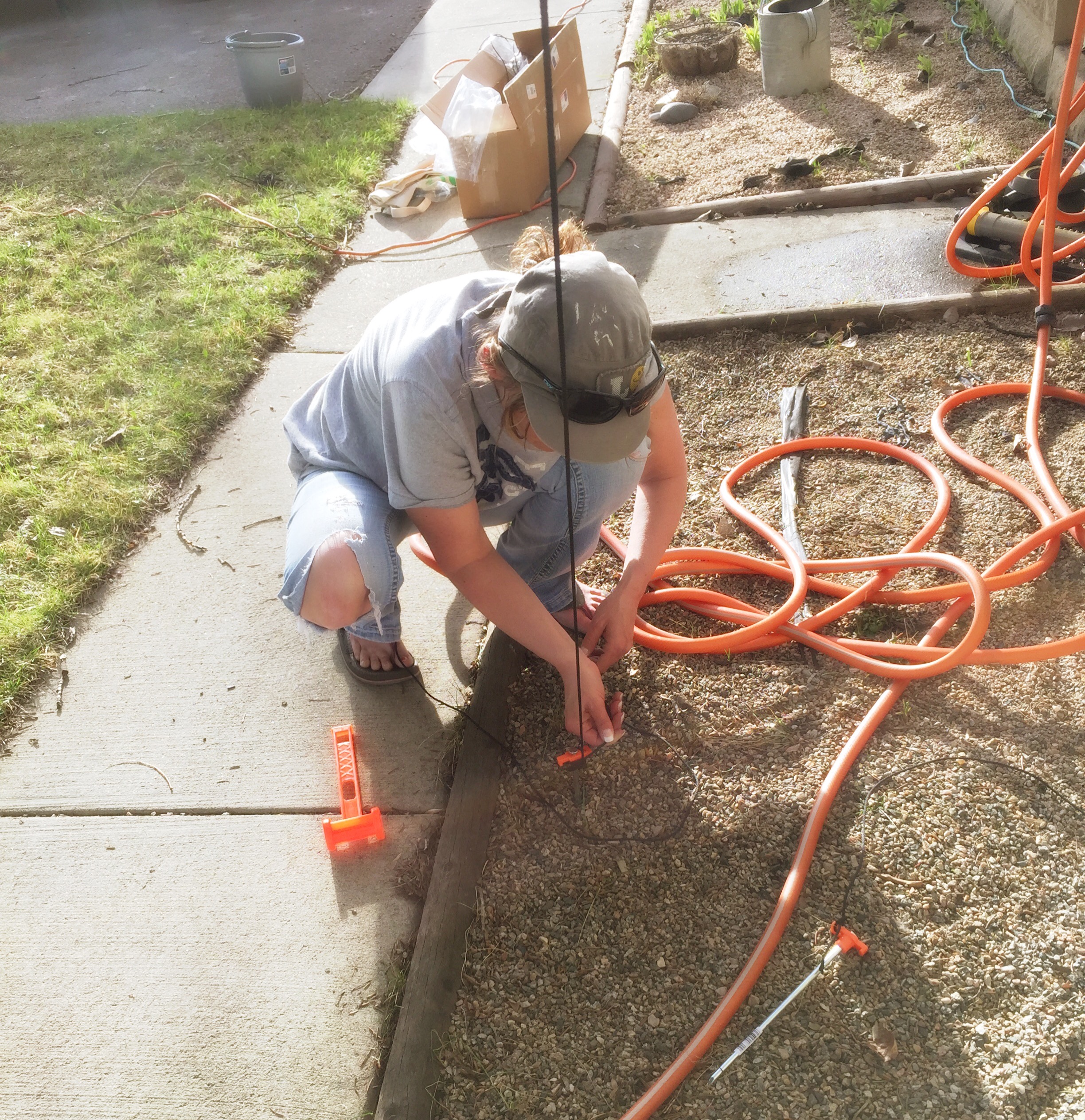 The awning was so delightful when installed; I absolutely had to take pictures. For the best photos, though, I thought I better park my ‘ole vintage Schwinn in the shots. The Schwinn was still in the back of the shed for winter storage, so I had to wrestle it out. It needed to be hosed down thoroughly. Youngest offspring noted that she’d like her bike out, too, so I wrestled that one from the depths. It needed the tires aired up. I finally parked the Schwinn, with a few flowers I’d rustled up stuck in the old metal basket for good effect, and realized that the photo wouldn’t be complete without the vintage flamingos and lawn chairs.