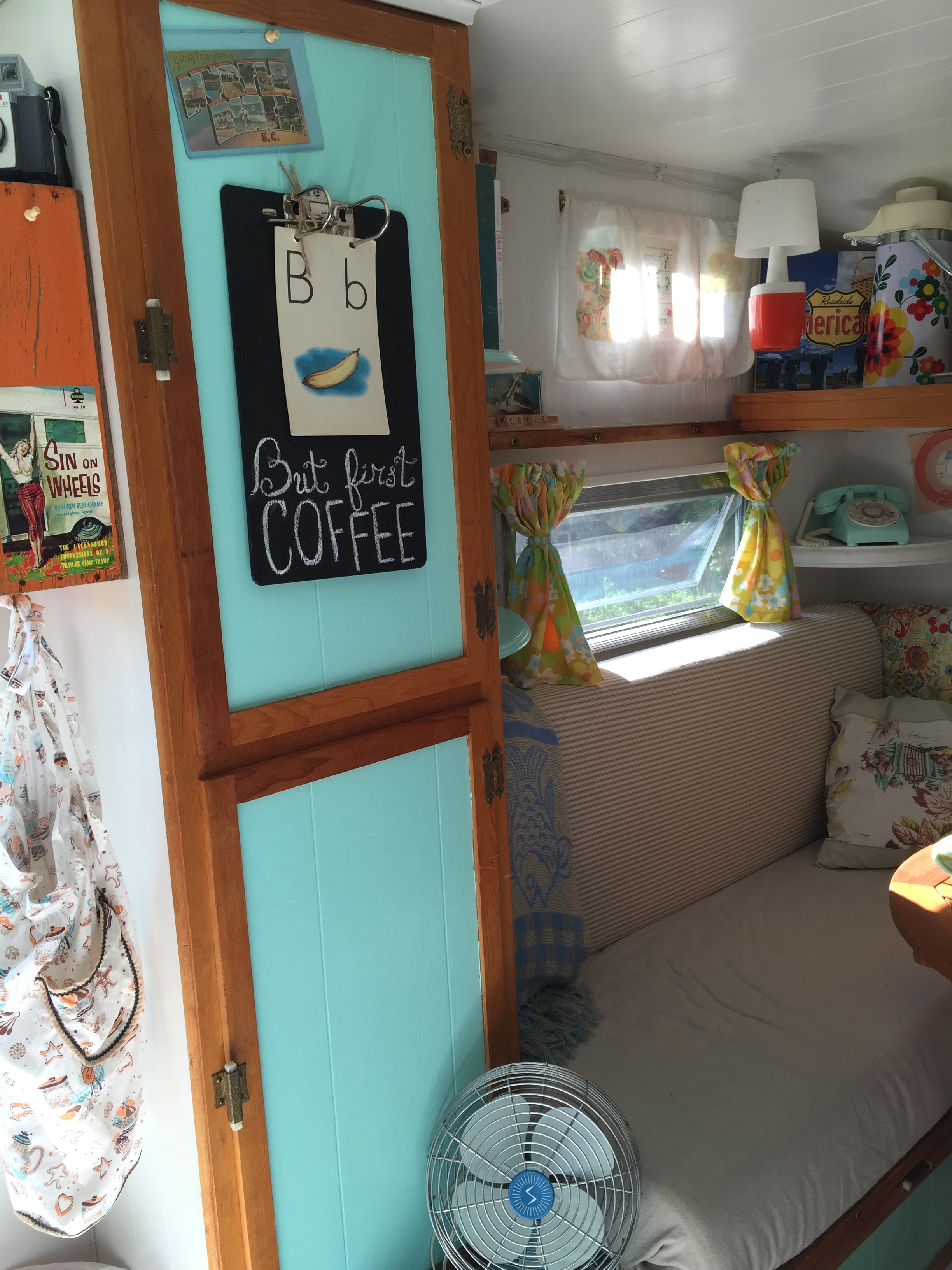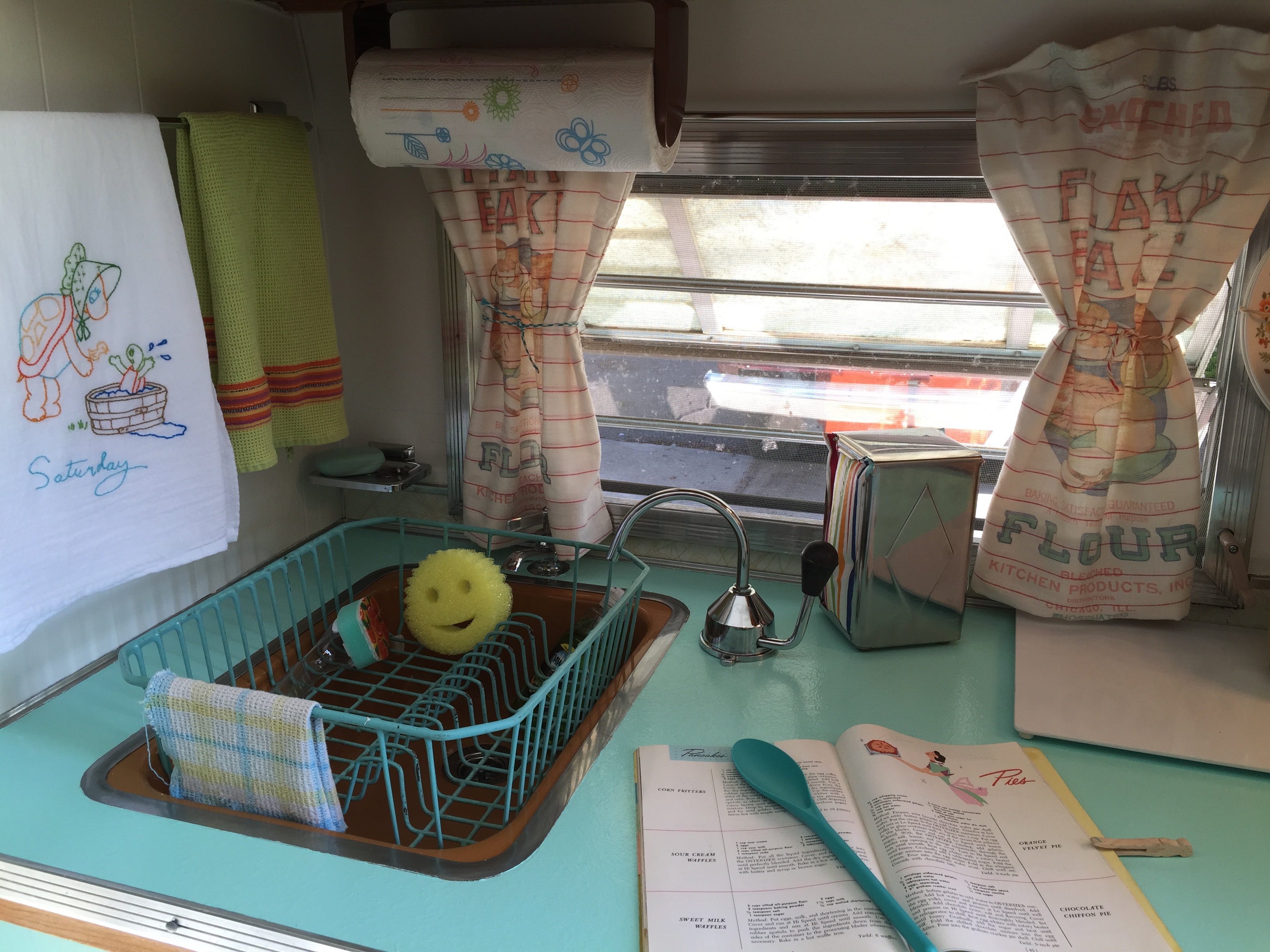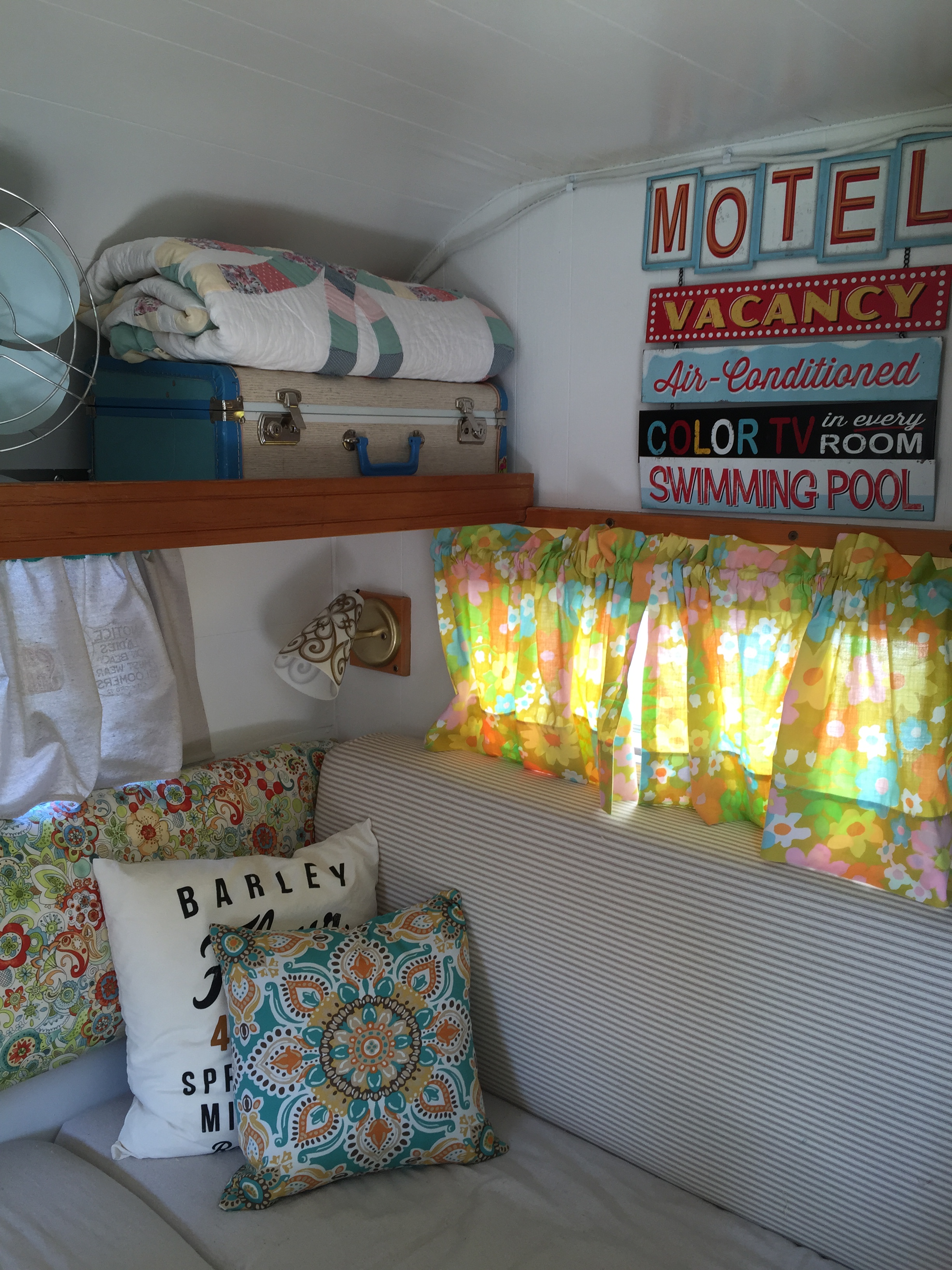 I just about freaked when I saw the curtain you’d fashioned for the windows behind the dinette from an old bed sheet. I had those exact same flower design sheet set when I was a child, which was several moons ago now in 70’s. Funny thing was, I was thinking about that pattern just the other day. How wild! Beautiful trailer!