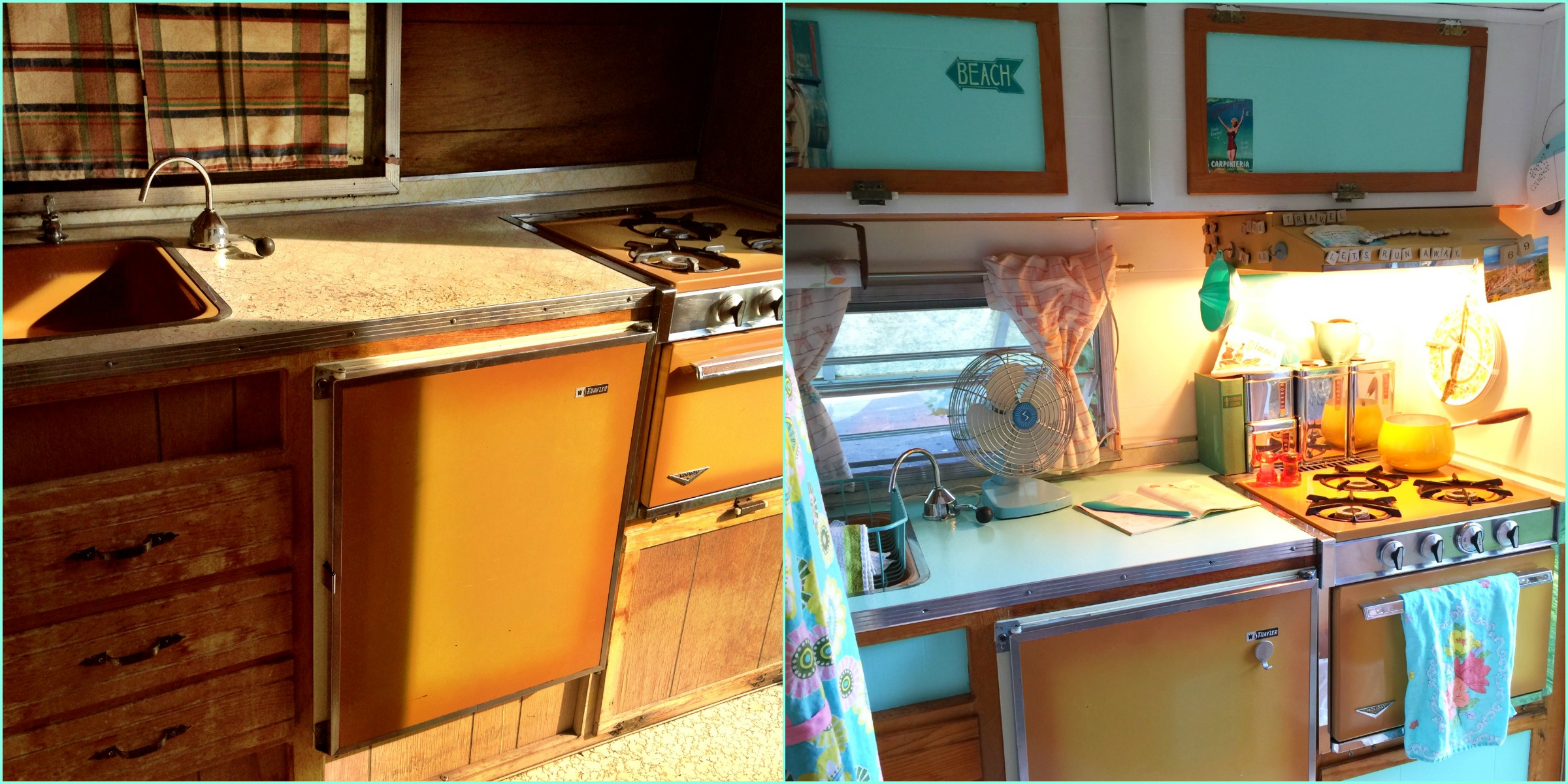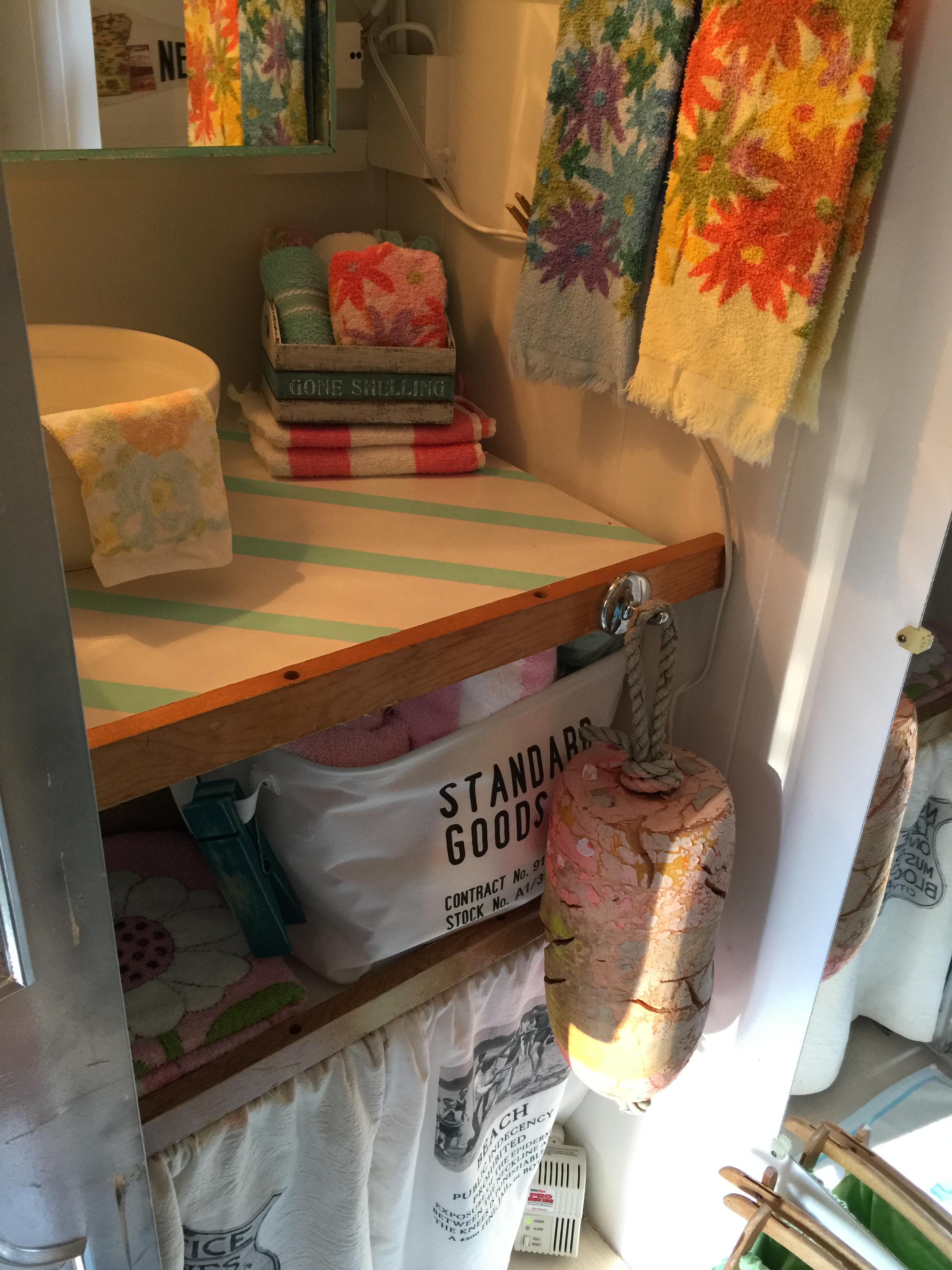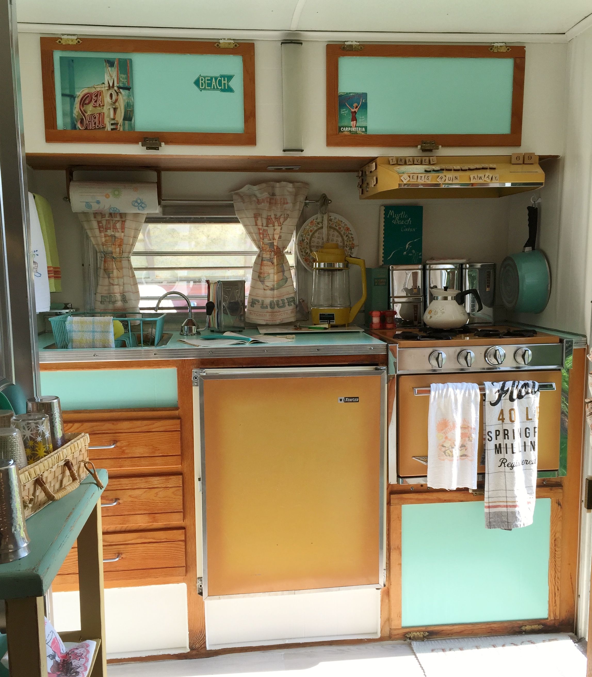I just about freaked when I saw the curtain you’d fashioned for the windows behind the dinette from an old bed sheet. I had those exact same flower design sheet set when I was a child, which was several moons ago now in 70’s. Funny thing was, I was thinking about that pattern just the other day. How wild! Beautiful trailer!