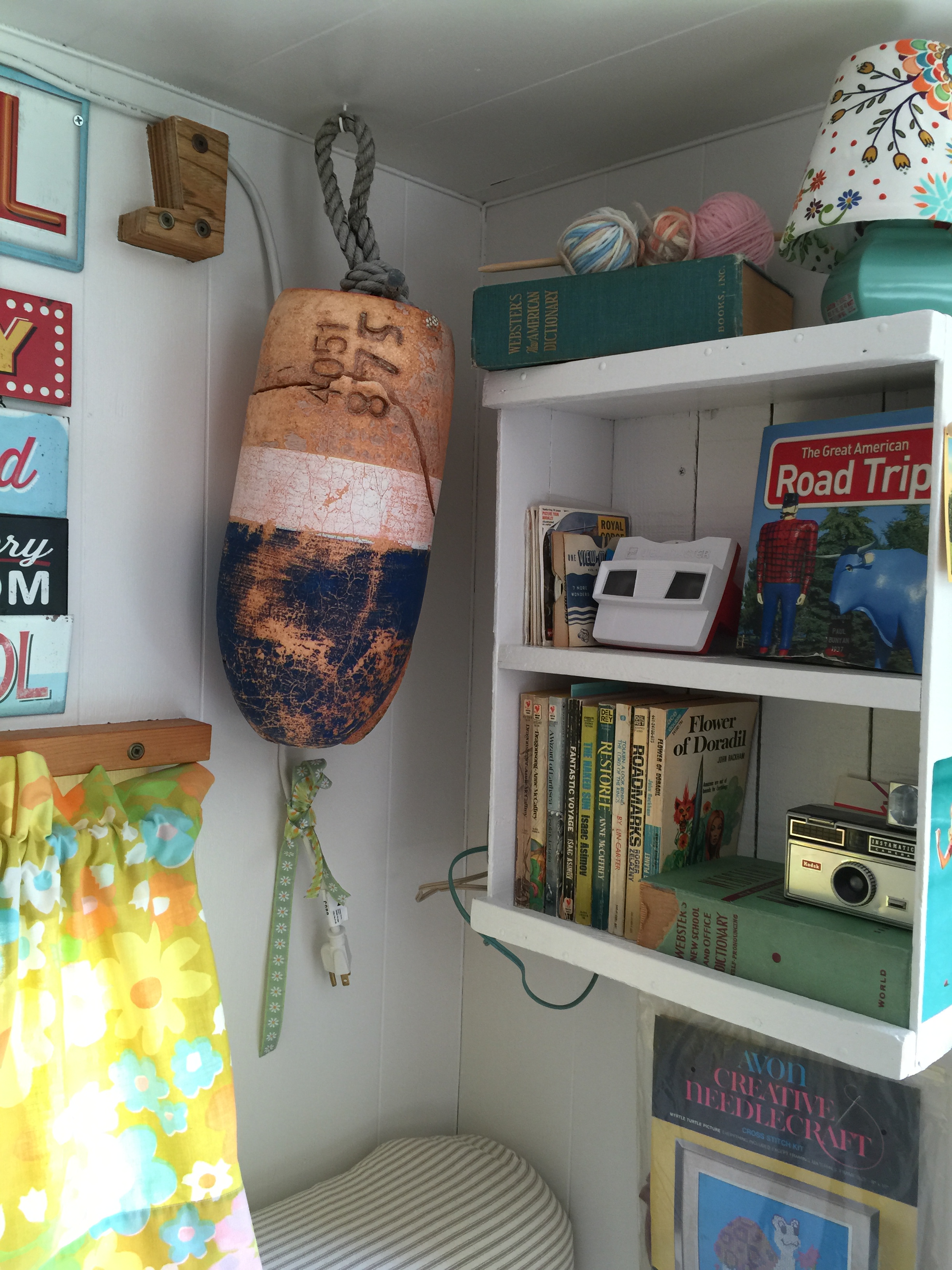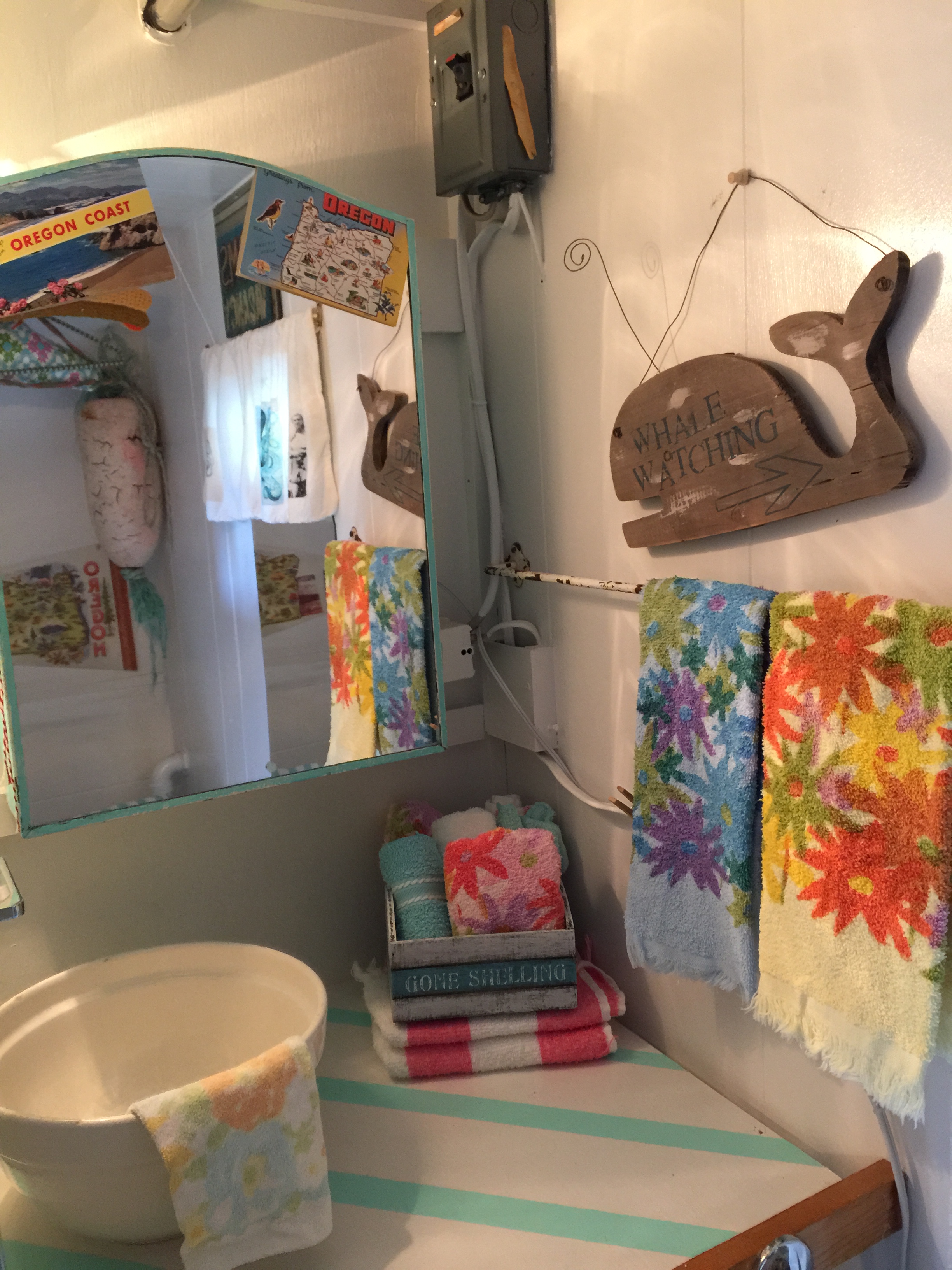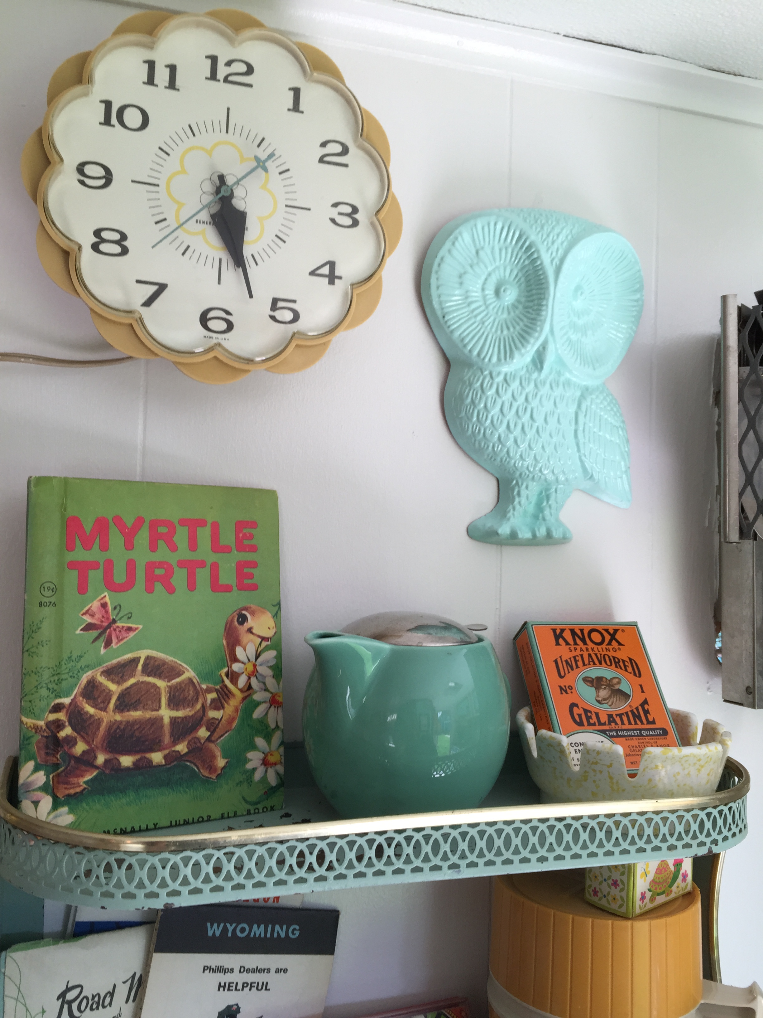 Myrtle was truly a labor of love. She is full of vintage goodness: her shelves hold an assortment of mid-century games, puzzles, View-Masters, slides, and cameras. Her bookshelf holds travel tomes and 1960’s Science Fiction pulp novels. All the road maps in Myrtle would be sure to take you on an interesting journey, as none of them date past 1969. Her cupboards are full of vintage melamine dishes, Raffiaware, mid-century pots and pans, and 1950’s utensils. The bathroom offers only vintage towels, and the bed linens are all mid-century. Her Zenith radio is a 1958 tube, and her electric fans hold all the charm of their mid-century origins (and all of the quirks -one only works sporadically; you know, when it’s in the mood).